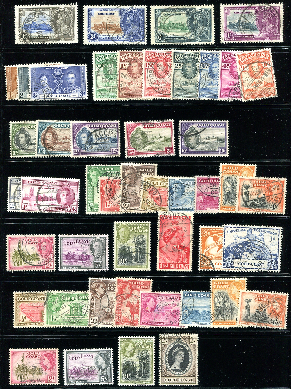 A couple of pages of pre-Ghana colonial era with a nice mix of better and common material, with lots of nice cancels noted. Better singles include #4 (possibly mint, no gum), #22, #23, the 1935 Silver Jubilee set and most of the two King George VI and the first QEII "Pictorial" sets (just missing a couple of common items). Great appearance and very few faults noted. 2024 Scott US$568.10 =