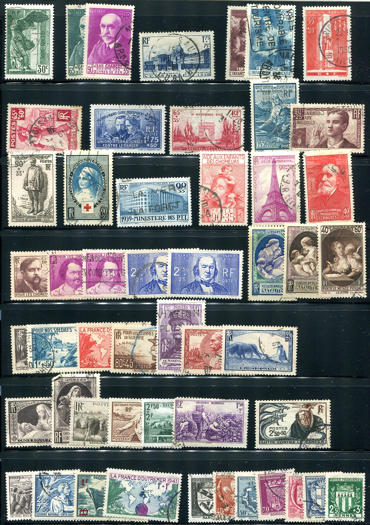 An assortment of used semi-postals issued 1937 to 1954 with "Intellectuals" (such as #B249-B254), "Coat of Arms", "Vichy" and a couple of Red Cross sets. Many with nice cancels, and no obvious faults noted. Lots of $5-$20 sets and singles here. 2024 Scott US$459.65 =