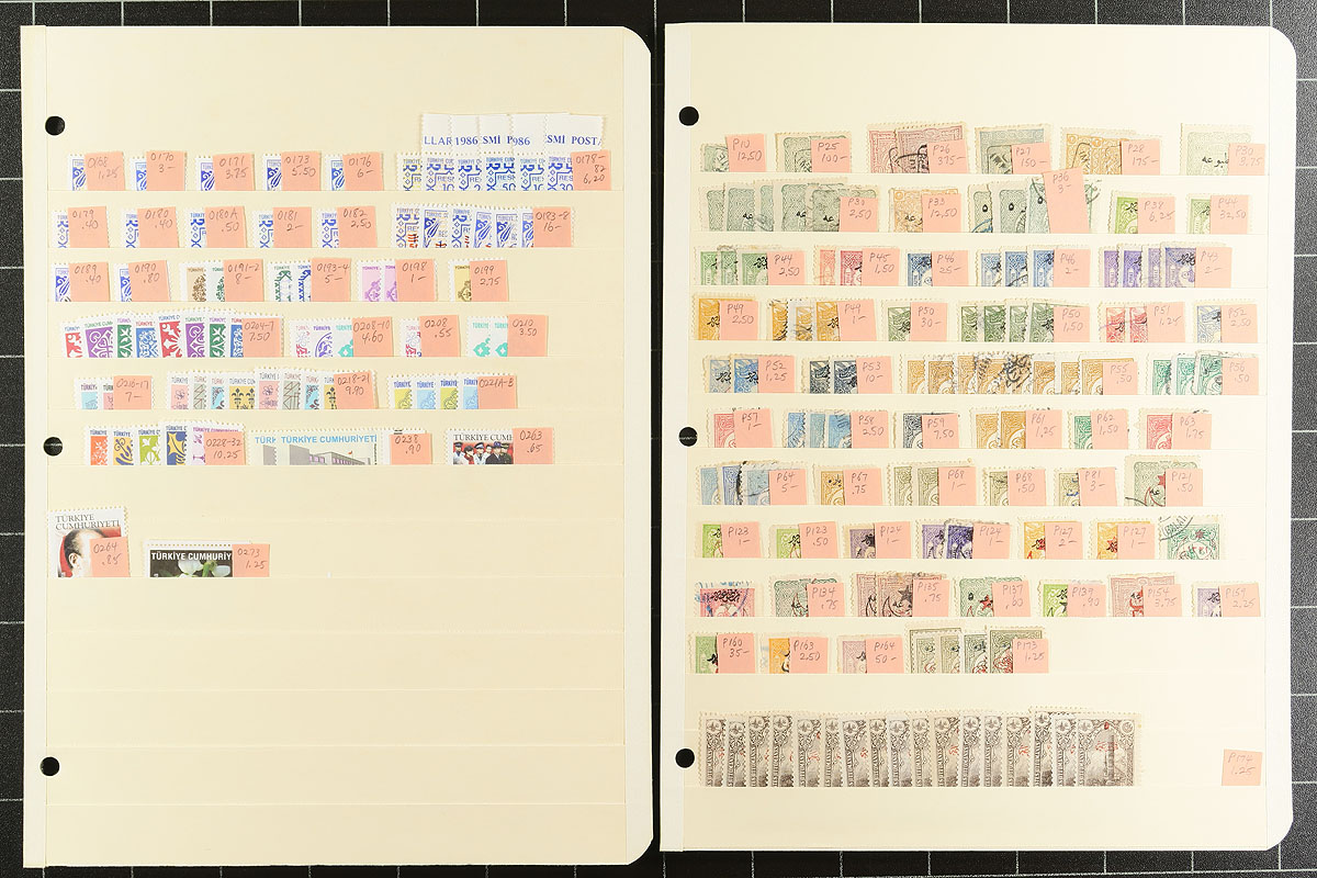 A fascinating and well organized accumulation of mint and used "Back of the Book" with postage dues (noted mint #J62), military stamps (with forgeries and reprints mix in), official, newspaper stamps (ignoring the stamps up to #P29, which are likely forgeries), postal tax as well as some "Anatolia" (or "Offices in Asia") and some North Cyprus. A wide range of issues, lots of overprints, this collector has done lots of the hard work for you, but there is still lots to be discovered here. All on 16 manila stockpages, most items individually numbered by Scott with (older) catalogue prices. Light to moderate duplication. Estimate =