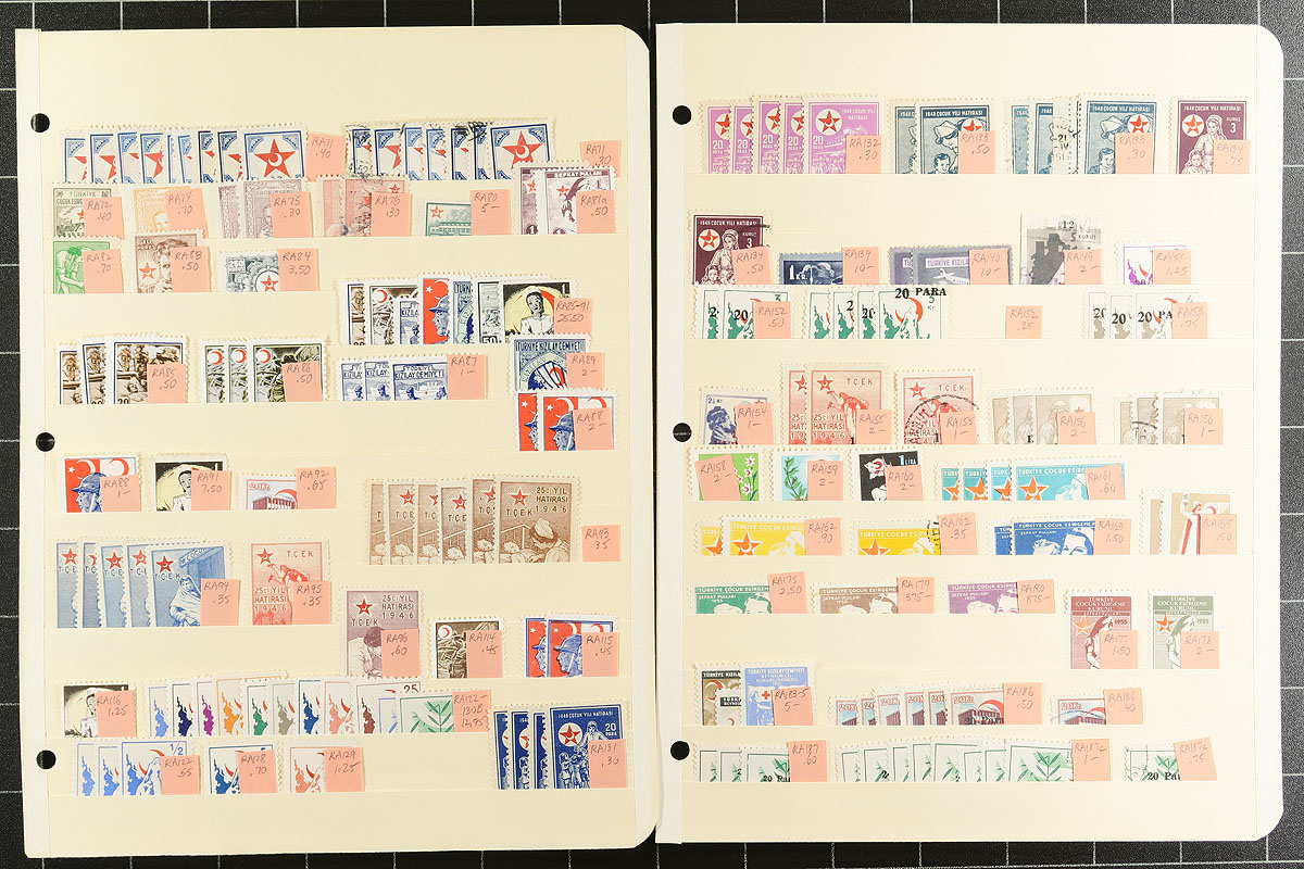 A fascinating and well organized accumulation of mint and used "Back of the Book" with postage dues (noted mint #J62), military stamps (with forgeries and reprints mix in), official, newspaper stamps (ignoring the stamps up to #P29, which are likely forgeries), postal tax as well as some "Anatolia" (or "Offices in Asia") and some North Cyprus. A wide range of issues, lots of overprints, this collector has done lots of the hard work for you, but there is still lots to be discovered here. All on 16 manila stockpages, most items individually numbered by Scott with (older) catalogue prices. Light to moderate duplication. Estimate =