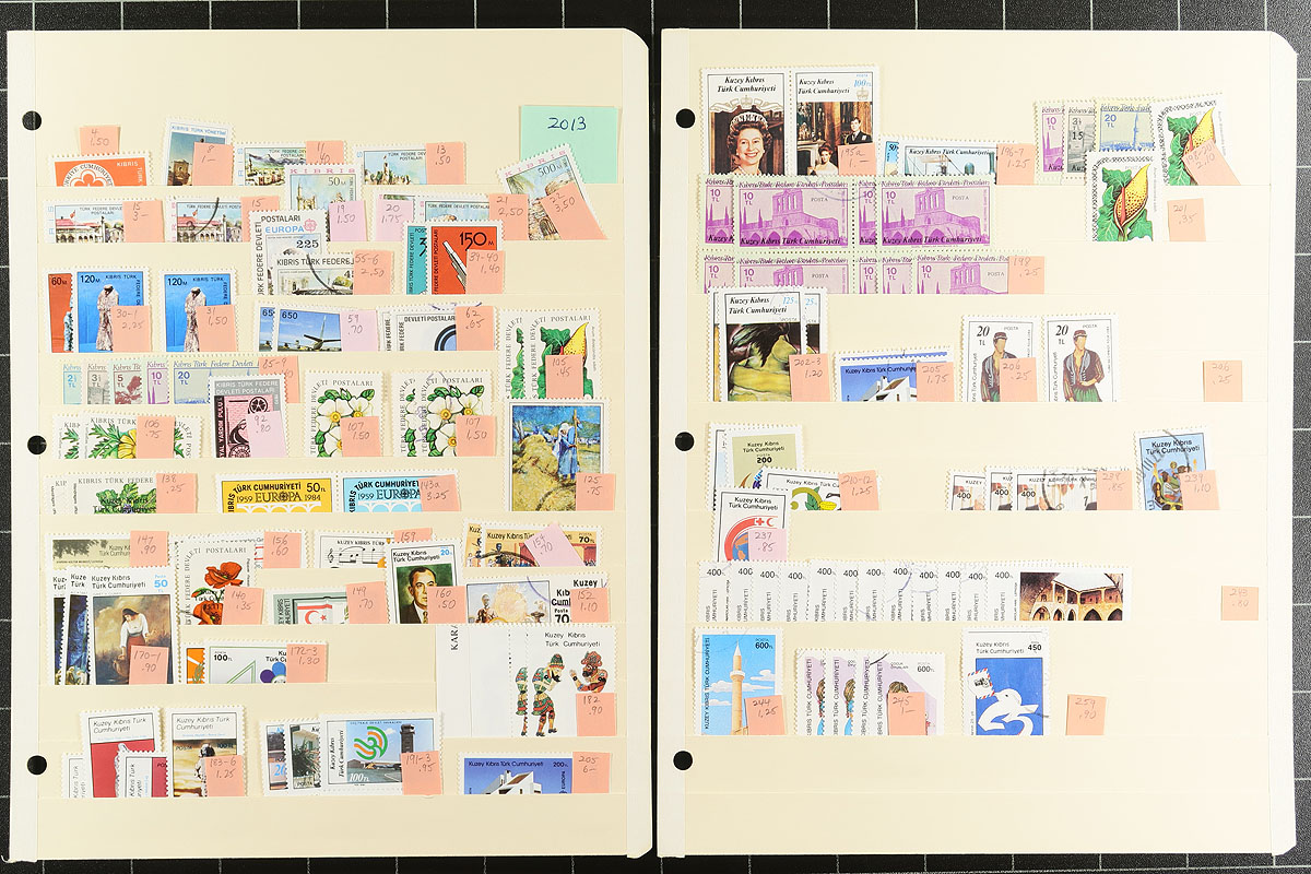A fascinating and well organized accumulation of mint and used "Back of the Book" with postage dues (noted mint #J62), military stamps (with forgeries and reprints mix in), official, newspaper stamps (ignoring the stamps up to #P29, which are likely forgeries), postal tax as well as some "Anatolia" (or "Offices in Asia") and some North Cyprus. A wide range of issues, lots of overprints, this collector has done lots of the hard work for you, but there is still lots to be discovered here. All on 16 manila stockpages, most items individually numbered by Scott with (older) catalogue prices. Light to moderate duplication. Estimate =
