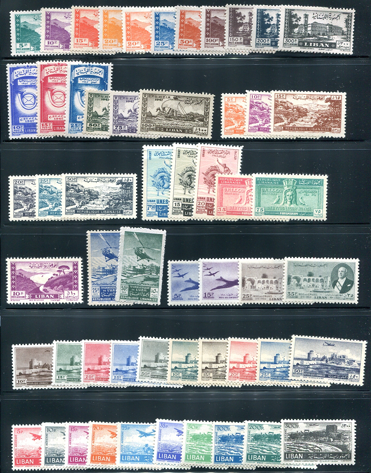 In under nine years, Lebanon issued 80 different airmail stamps, and a mint example of almost each one is here, just missing most of the expensive 1947 "redrawn" issue. The material that is here is fresh, well centered and most are single hinged (with a few that are never hinged), and most are in complete sets. 2024 Scott US$577.25 =
