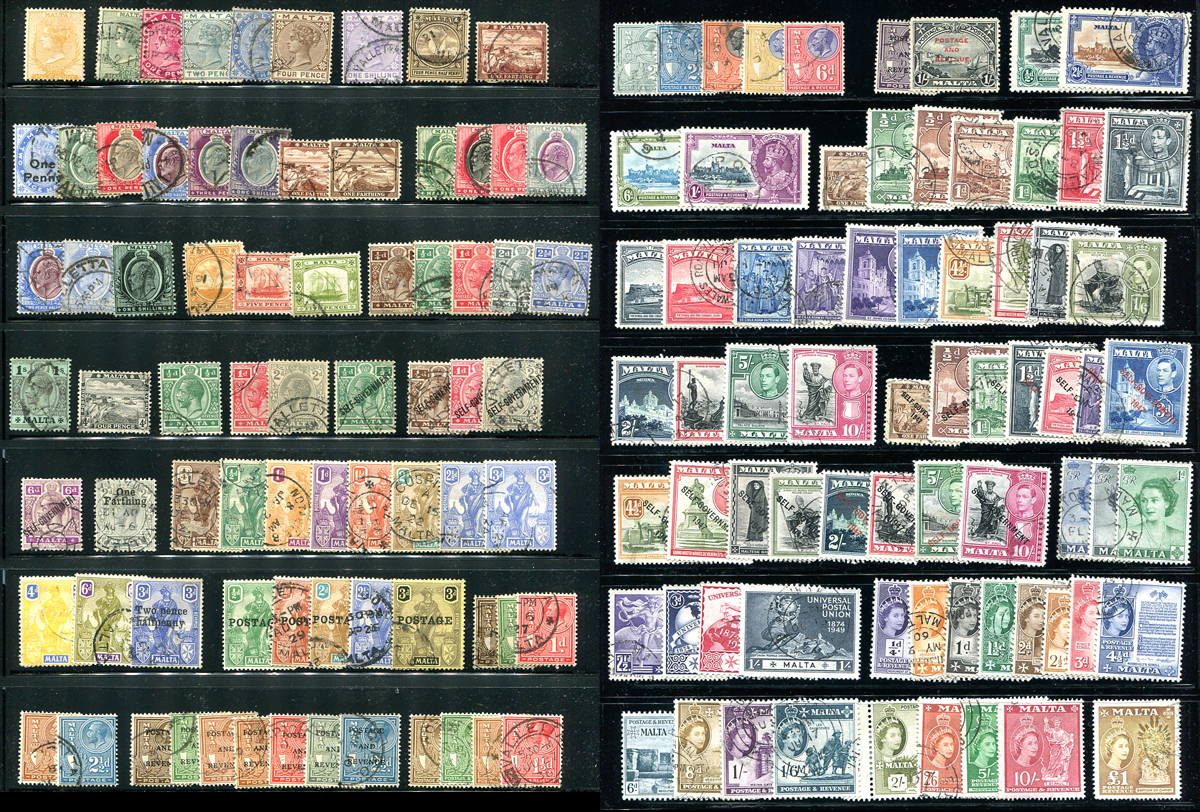 Two pages of used, regular issues, from Queen Victoria to the early Queen Elizabeth issues. Includes a selection of "Ships", Valetta Harbour, "Malta" (and with various overprints), a nice set of the 1935 Silver Jubilee and then two complete sets of King George VI and one of QEII "pictorial" issues to £1. Much cleaner than normally seen. Better singles include #7, #59, #67, #91. 2024 Scott US$556.20 =