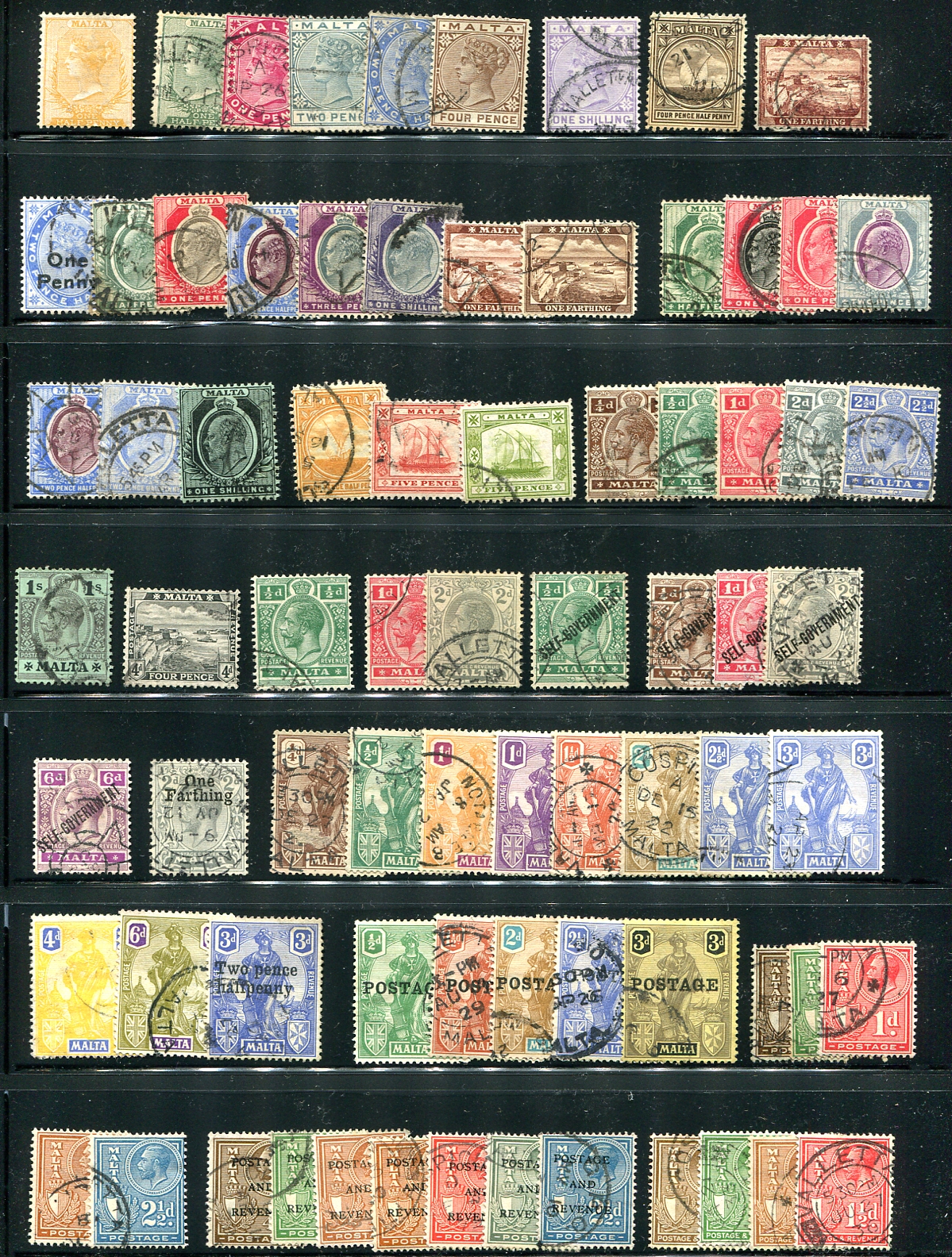 Two pages of used, regular issues, from Queen Victoria to the early Queen Elizabeth issues. Includes a selection of "Ships", Valetta Harbour, "Malta" (and with various overprints), a nice set of the 1935 Silver Jubilee and then two complete sets of King George VI and one of QEII "pictorial" issues to £1. Much cleaner than normally seen. Better singles include #7, #59, #67, #91. 2024 Scott US$556.20 =