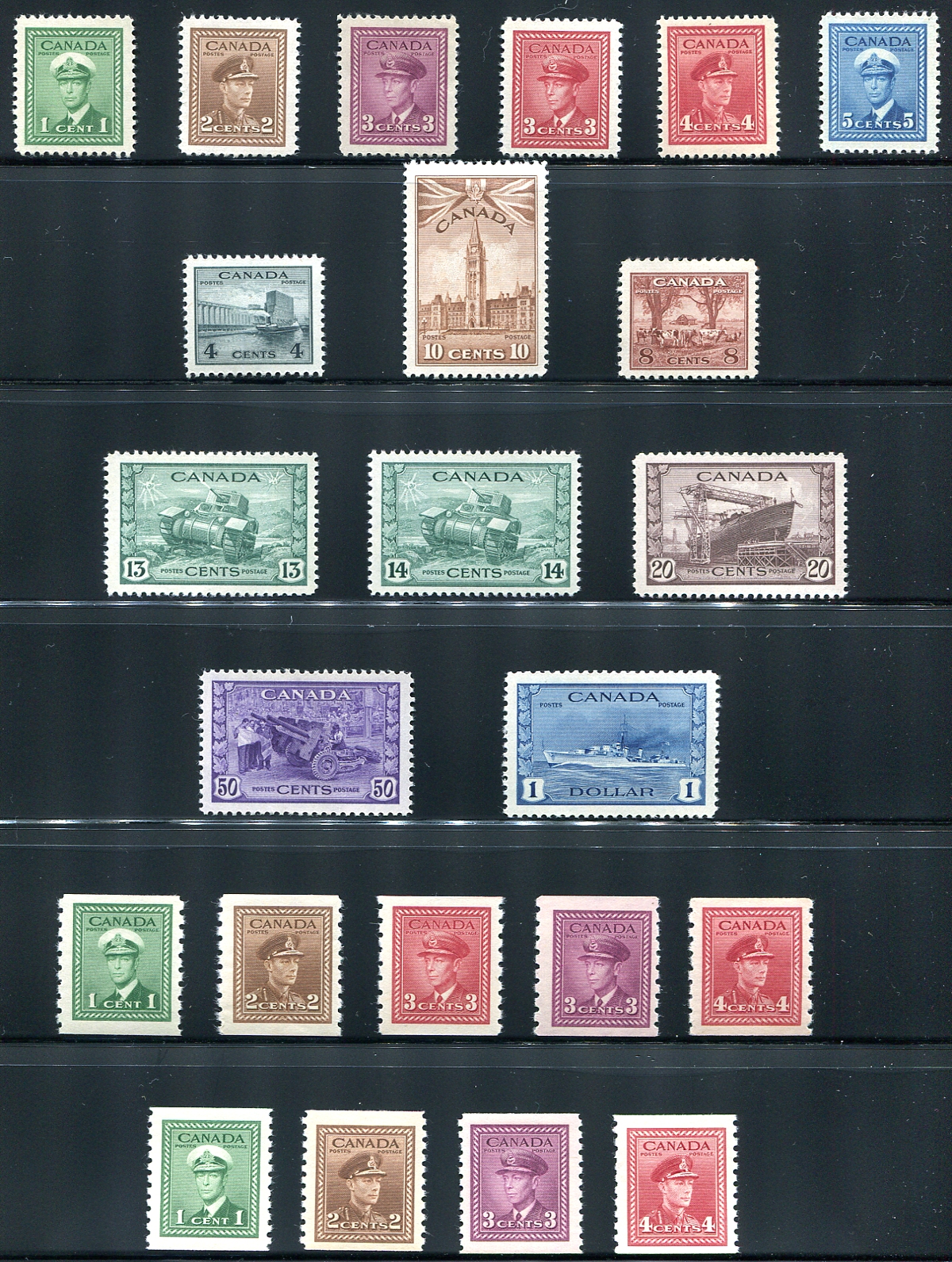Fresh and selected quality VF mint Never Hinged 1942-1943 complete GeoVI War Issue set of 14 plus both coil sets (in the perf 8 and the scarcer perf 9½ types). The high values are particularly nice. Unitrade is $382.50 for the VF mint NH group. 2025 Scott Classic US$260.20 =