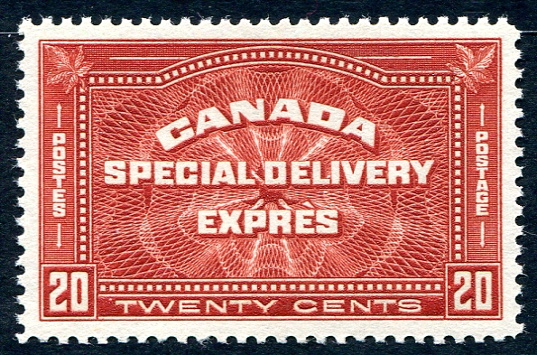 Spectacular and Superb mint Never Hinged JUMBO MARGIN example of the 1930 issue 20c henna brown "TWENTY CENTS" Special Delivery stamp. This design was eventually deemed to be too unilingual (the text in the value tablet was in English only). The #E5 corrected this problem. Unitrade is $180.00 for Very Fine mint Never Hinged. This eye-catching monster of a stamp is worth full catalogue and more! 2025 Scott US$125.00 =