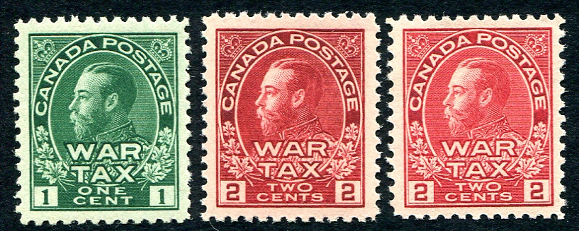VF mint Never Hinged trio of the 1915 George V Admiral "War Tax" issues, with the 1c green, 2c carmine and 2c rose carmine shades. Not often found this nice! 2025 Scott US$300.00 =
