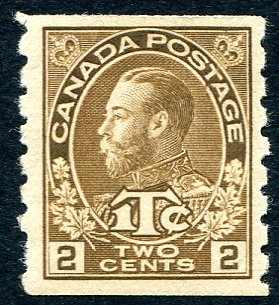 F/VF mint Never Hinged example of the of the rare Die I type of the 1916 issue 2c+1c brown GeoV Admiral War Tax coil. Missing from most Canadian collections we see. 2025 Scott US$540.00 =