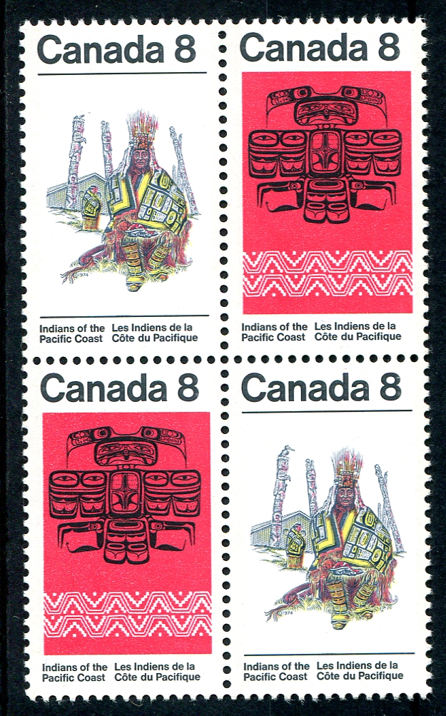 Very Fine mint Never Hinged block of four of the 1974 issue 8c Pacific Coast Indians, showing the completely "missing bird on the totem" error at position 28 (the UL stamp in the block). A superb showpiece example of a popular modern error. 2024 Unitrade =