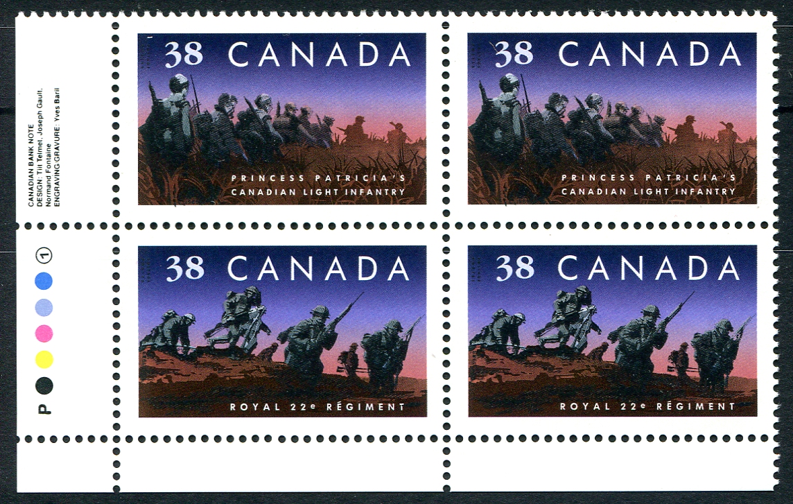 VF mint Never Hinged lower-left inscription block of four of the 1989 issue 38c "Regiments" commemorative. The vast majority of these stamps were withdrawn due to poor quality control. 2024 Unitrade =