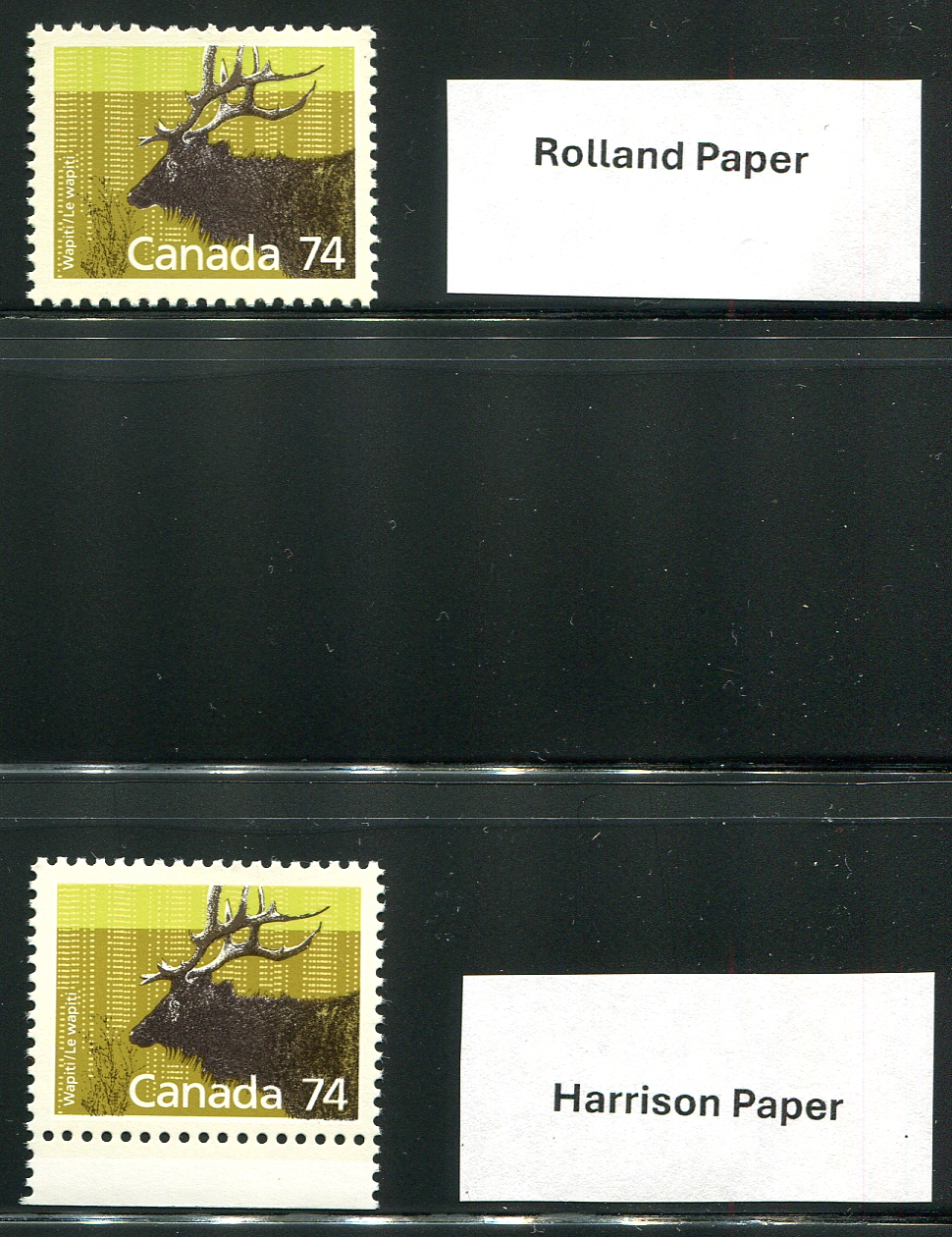 VF mint Never Hinged example of the exceedingly SCARCE Rolland Paper printing of the 1988 issued 74c Wapti stamp, from the 1988-1990 Mammal mid-value definitive series. Comes with an original Saskatoon Stamp Company listing for a corner block, and a single on the regular issue Harrison Paper. Only 200-300 copies believed to exist, and the first we have handled. 2024 Unitrade =