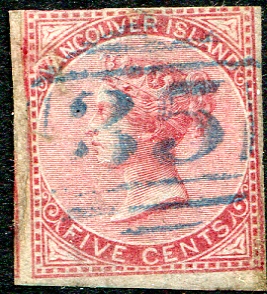 An intriguing used example of BC #5, with trimmed perforations and margins added to appear to be the rare and elusive imperforate BC #3. Comes with 2025 Vincent Graves Greene certificate, which states such. An interesting attempt to change a $300.00 catalogue stamp into a $11,000.00 catalogue stamp! The "35" (Victoria) numeral postmark (in blue) is legitimate and contemporary to the original stamp. Makes for a great "space-filler" and a good story. Estimate =