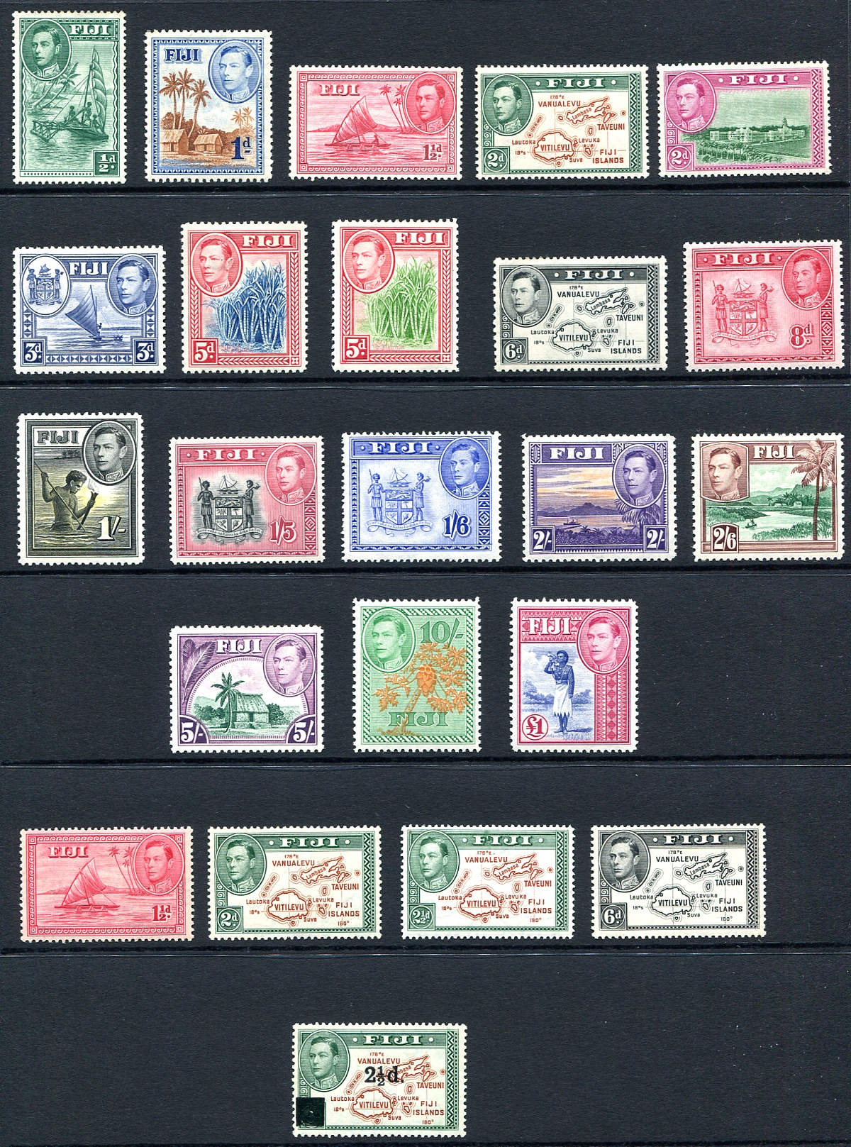 Complete mint Hinged set of the 1938-1955 George V Pictorial series of 18 stamps, plus the 1940-1949 "redrawn" values (4) and the 1941 surcharged stamp. Nice to get these complete. 2025 Scott US$230.80 =