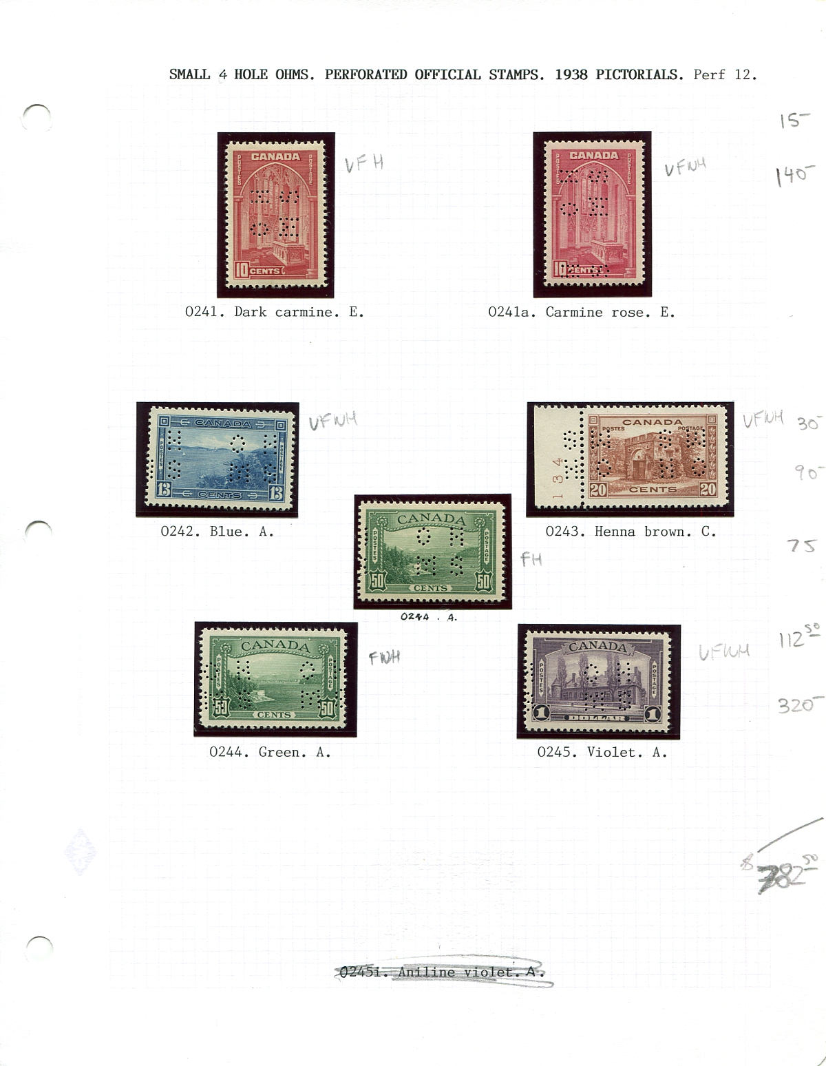 Mostly VF and mostly Never Hinged complete set of 1938 KGVI pictorials (plus an extra example of the 50c value), all with 4-hole OHMS official perfins. All neatly arranged in hingeless mounts on quadrille album page. See scan for details on perfin positions and condition. 2024 Unitrade =