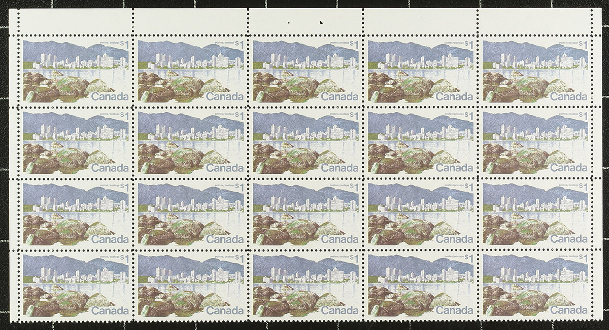 Sheet margin block of 20 of the 1972 issue $1.00 Vancouver (perf 11 x 11) on the scarce DF horizontally ribbed paper. 2024 Unitrade =