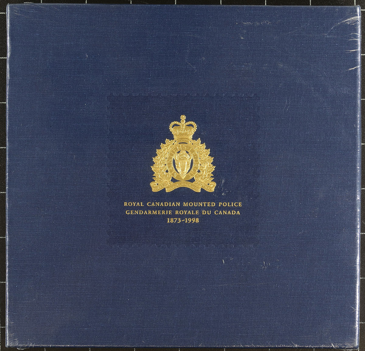 Thematic Collection #81. VF Post Office sealed 1998 issued RCMP Stamp and Coin set containing a souvenir sheet, FDC, illustrated booklet and .9999 pure silver 1oz coin. A liminted edition set, issued in conjunction with the Royal Canadian Mint. Undervalued in Unitrade at $75.00, considering we rarely see this, and the 1oz of Silver alone is worth over $50.00 if you melted it! Estimate =