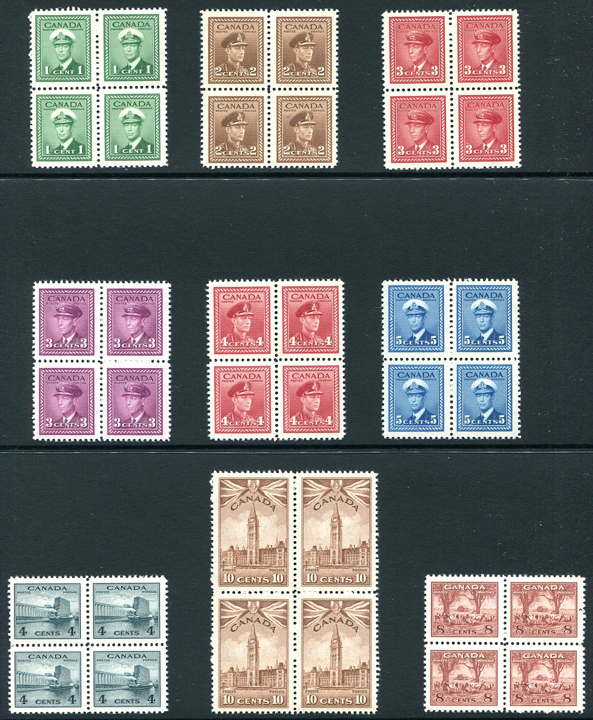 VF mint Never Hinged set of blocks of four of the 1942-1943 War issue. Perfection! The high values are exceptionally nice. A showpiece set. Unitrade is $1,036.00 for VF MNH blocks. 2025 Scott US$693.80 =