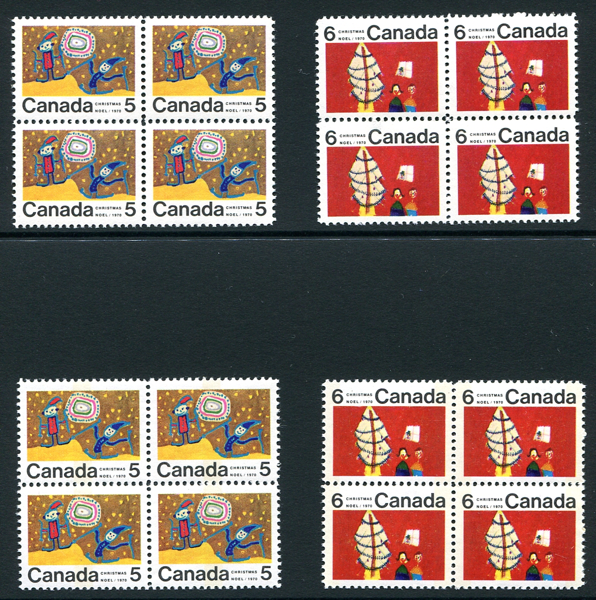 VF mint Never Hinged identical centre blocks of four of the 5c and 6c 1970 Christmas issue, both regular and with Winnipeg tagging. NOTE: the BOTH the 6c blocks are WITHOUT the "Scratch through Window" variety and as such is worth a 50% premium. Very scarce modern items. 2024 Unitrade =