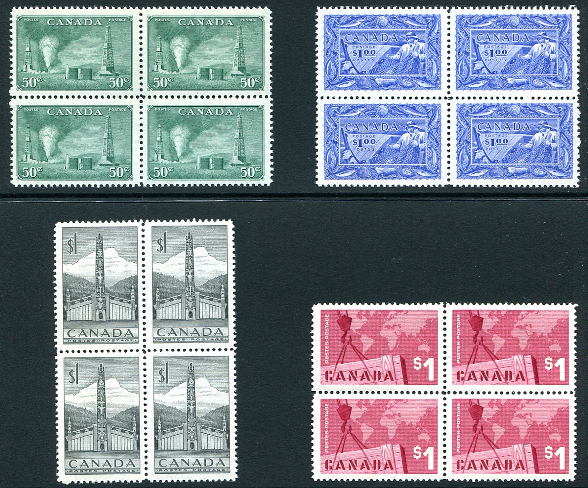 VF mint Never Hinged, high-value blocks of four including the 1950 Oil Wells, 1951 Fisheries, 1953 Totem and 1963 Export. A nice group of high-value blocks, all of which were "bait" for philatelic speculators in the late 1970's / early 1980's. 2025 Scott US$223.00 =