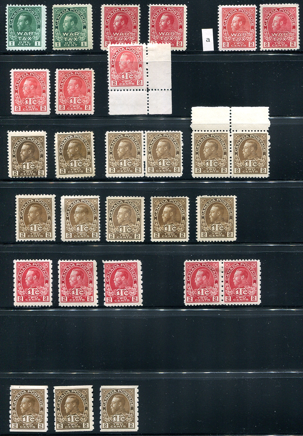 Mint stock of George V Admiral War Tax stamps, neatly arranged on a single stocksheet. A total of 28 stamps, and although we did notice a couple Never Hinged, expect them all to be Hinged. 2025 Scott US$1035.00 =