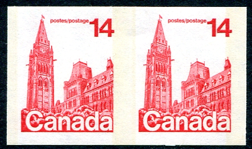 VF mint Never Hinged imperforate pairs of the 14c red Parliament coil stamp. One of the ever-popular QEII imperforate varieties of the time, this one being one of the most reasonably priced in the catalogue. 2024 Unitrade =