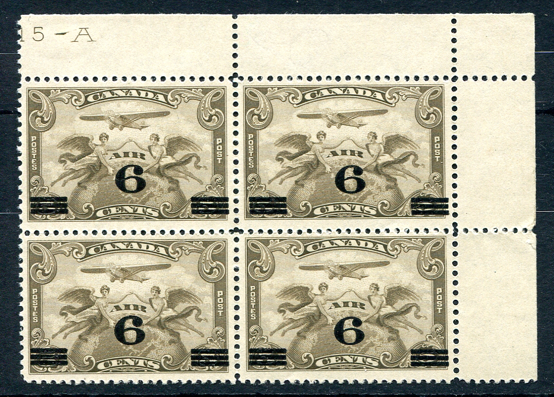 VF mint Never Hinged block upper-right corner block of four of the 1932 issue 6c on 5c airmail with the top left stamp (sheet position 4) showing the "swollen breast" constant plate variety. All the stamps are Never Hinged, LH in selvedge only. An eye-catching positional showpiece. 2024 Unitrade =