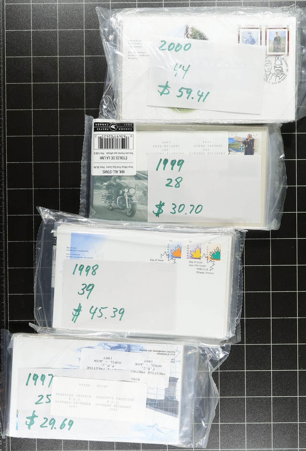 First Day Covers. Collection of Canada first day covers, 1990-2004, containing 458 covers, all in quarterly or half year packages (almost all still in original Canada Post packaging). Original retail price totals $537.24. A nice lot for the collector filling in spots, or the show dealer. Estimate =