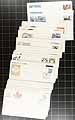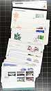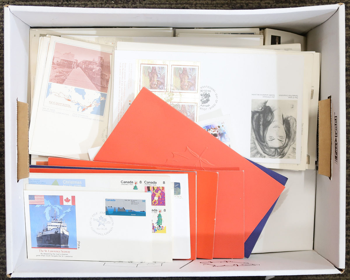 First Day Covers. Accumulation of roughly 1,000 Canada first day covers in a bankers box, 1970's-1990's, with a few covers on either side of the given range. We note singles, sets, plate blocks, souvenir sheets, and high denomination frankings. The lot also includes a few larger sized envelopes for larger souvenir sheet and plate block frankings (including the popular Art series issues). Duplication up to 5 to 10 for some issues. A nice lot for collectors or dealers. Estimate =