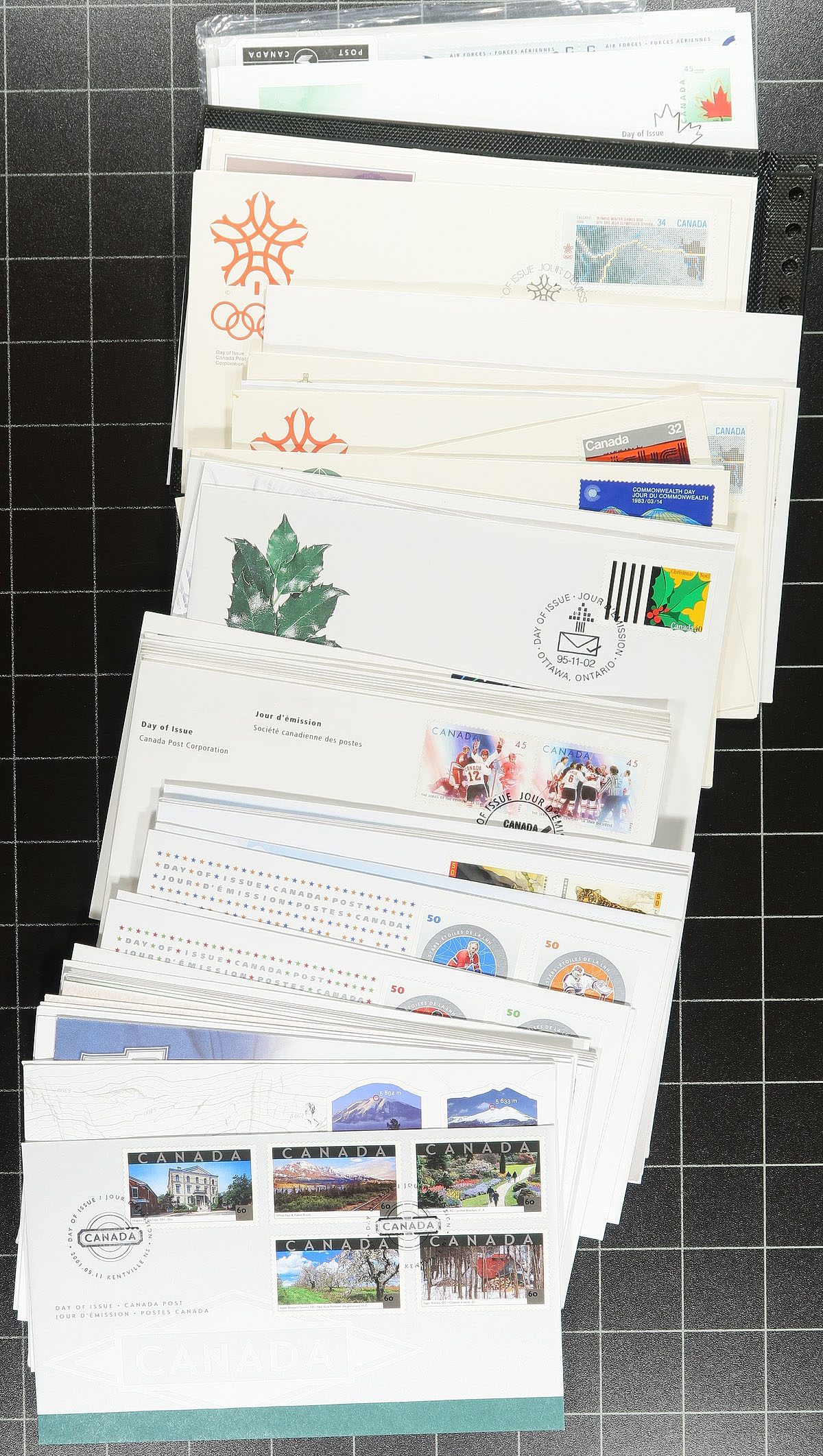 First Day Covers. Accumulation of roughly 1,000 Canada first day covers in a bankers box, 1970's-1990's, with a few covers on either side of the given range. We note singles, sets, plate blocks, souvenir sheets, and high denomination frankings. The lot also includes a few larger sized envelopes for larger souvenir sheet and plate block frankings (including the popular Art series issues). Duplication up to 5 to 10 for some issues. A nice lot for collectors or dealers. Estimate =