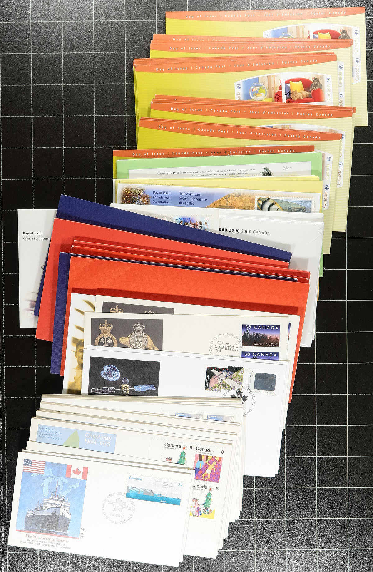 First Day Covers. Accumulation of roughly 1,000 Canada first day covers in a bankers box, 1970's-1990's, with a few covers on either side of the given range. We note singles, sets, plate blocks, souvenir sheets, and high denomination frankings. The lot also includes a few larger sized envelopes for larger souvenir sheet and plate block frankings (including the popular Art series issues). Duplication up to 5 to 10 for some issues. A nice lot for collectors or dealers. Estimate =