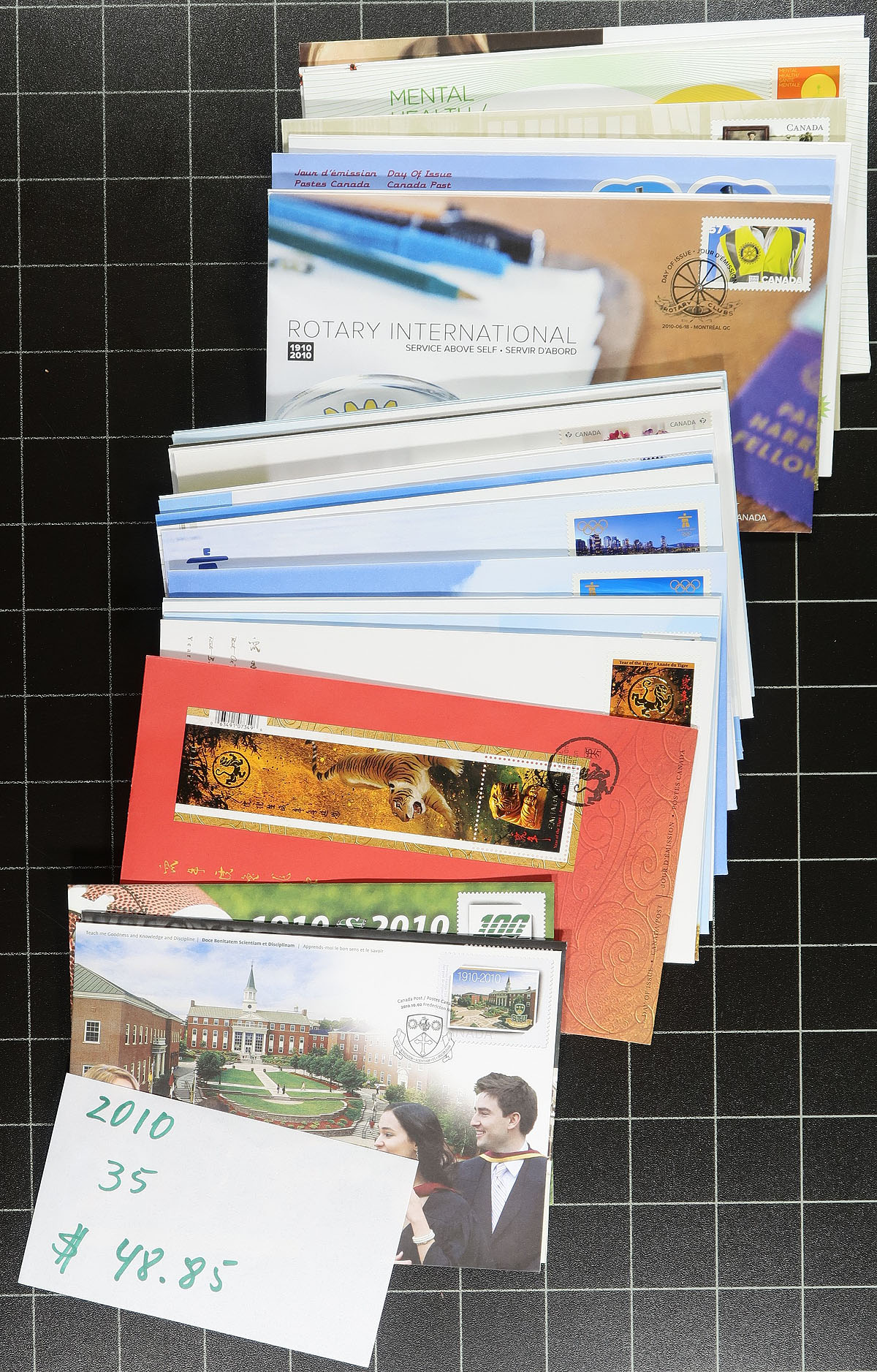 First Day Covers. Collection of Canada first day covers, 2006-2010, containing 205 covers, all in quarterly or half year packages (almost all still in original Canada Post packaging). Original retail price totals $225.62 A nice lot for the collector filling in spots, or the show dealer. Estimate =