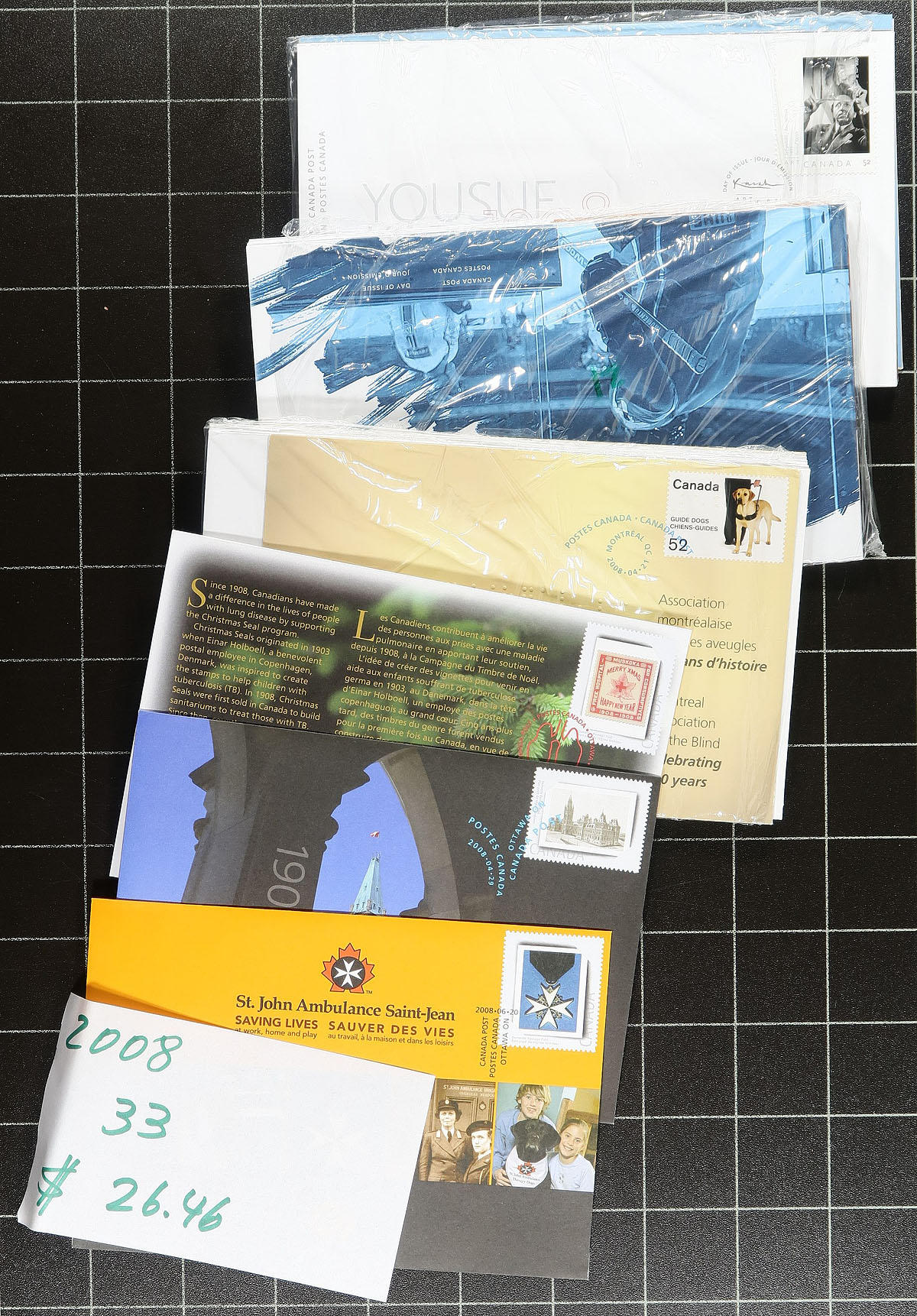 First Day Covers. Collection of Canada first day covers, 2006-2010, containing 205 covers, all in quarterly or half year packages (almost all still in original Canada Post packaging). Original retail price totals $225.62 A nice lot for the collector filling in spots, or the show dealer. Estimate =