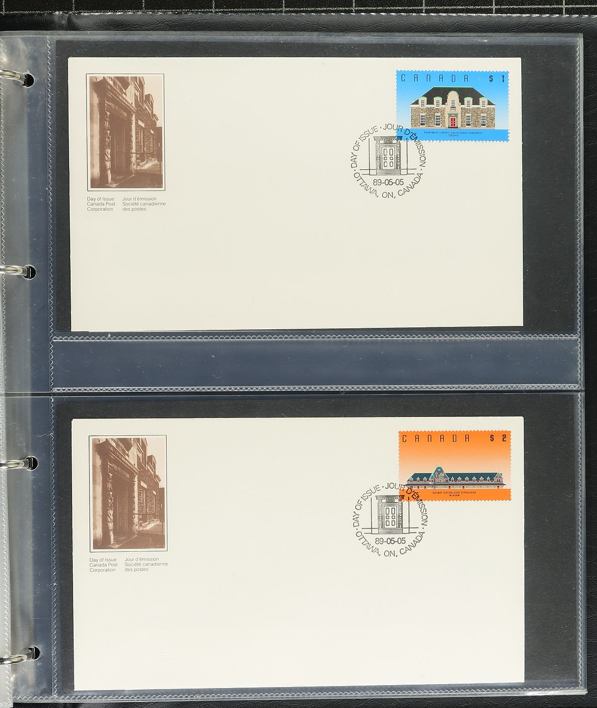 First Day Covers. Collection of roughly 360 Canada first day covers, 1970's-1989, all neatly organized in roughly 75 Vario-style stock pages, housed in 4 fairly thick binders. We note singles, sets, coils, booklet panes, plate blocks (including a few matched sets), souvenir sheets, and high denomination frankings. A nice clean lot. Estimate =
