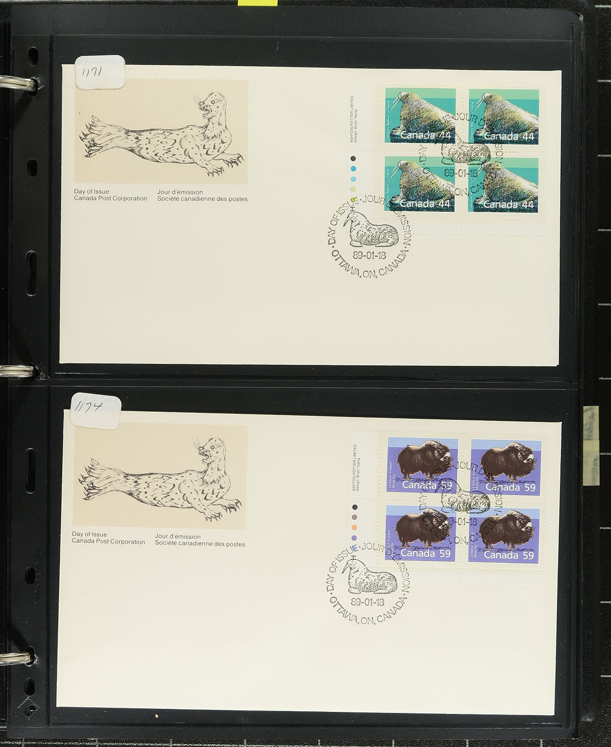 First Day Covers. Collection of roughly 360 Canada first day covers, 1970's-1989, all neatly organized in roughly 75 Vario-style stock pages, housed in 4 fairly thick binders. We note singles, sets, coils, booklet panes, plate blocks (including a few matched sets), souvenir sheets, and high denomination frankings. A nice clean lot. Estimate =