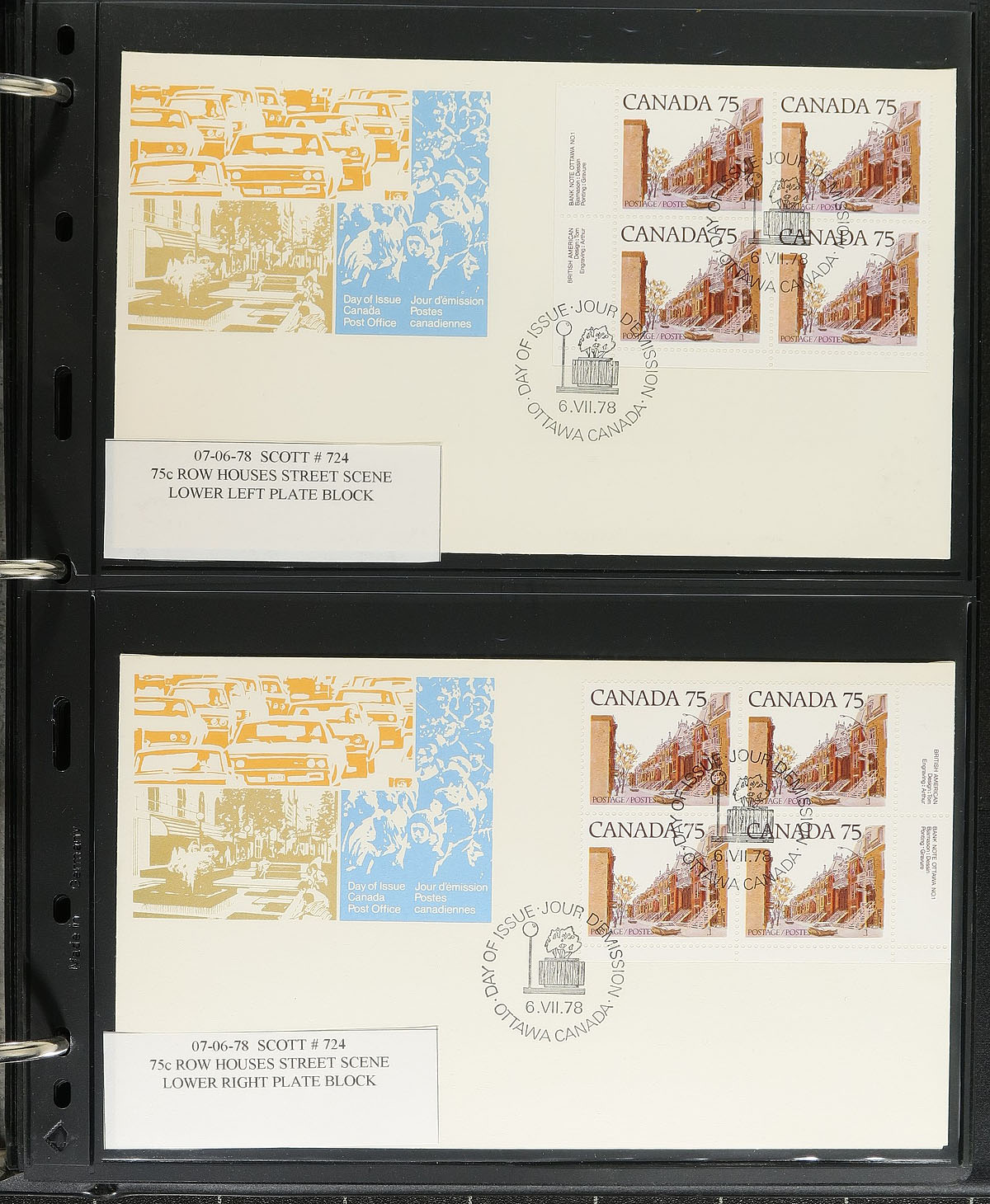 First Day Covers. Collection of roughly 360 Canada first day covers, 1970's-1989, all neatly organized in roughly 75 Vario-style stock pages, housed in 4 fairly thick binders. We note singles, sets, coils, booklet panes, plate blocks (including a few matched sets), souvenir sheets, and high denomination frankings. A nice clean lot. Estimate =