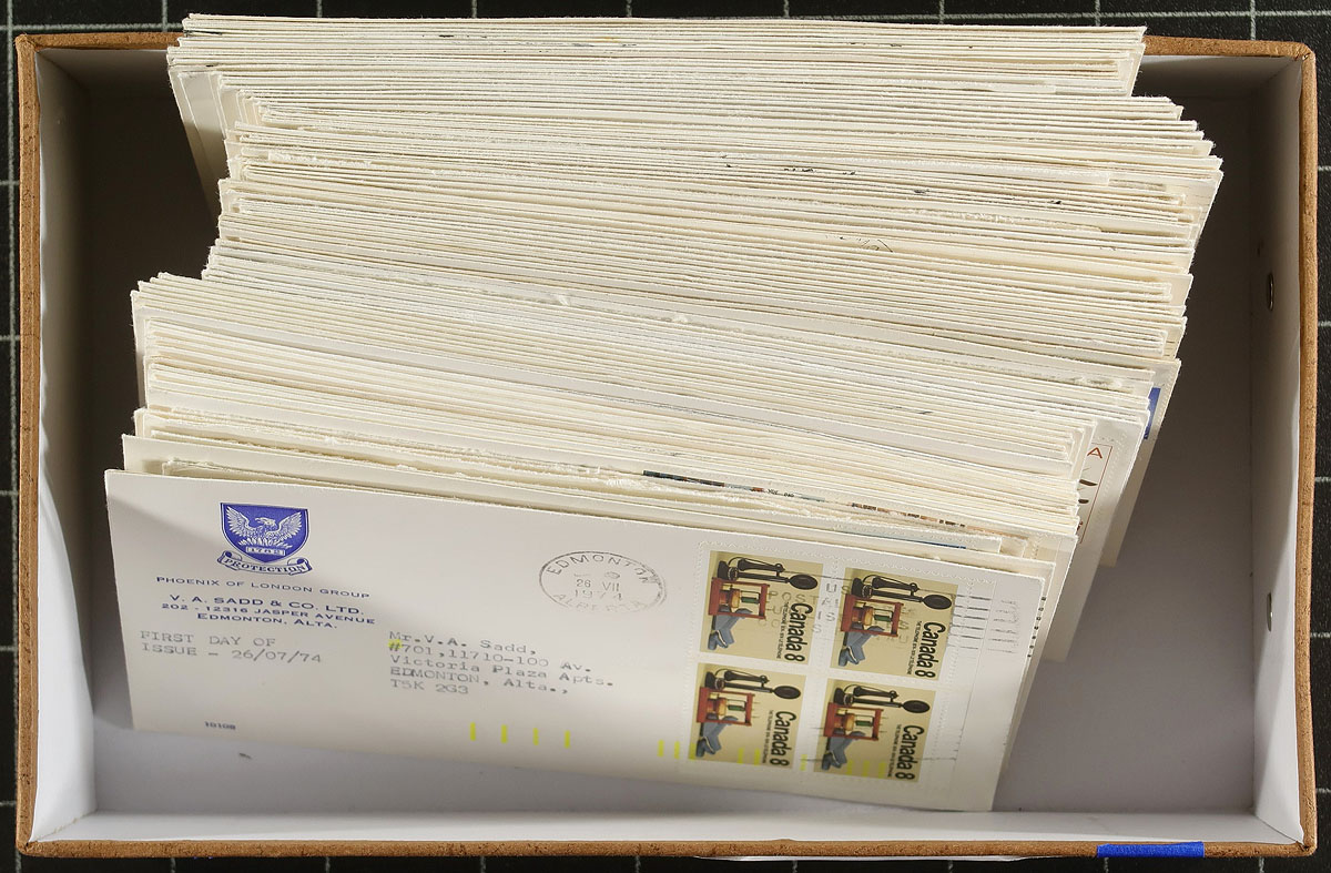 First Day Covers. Interesting collection of "V. A. Sadd" Canada first day covers, 1967-1974. The collection consists of covers sent to Mr. Sadd, or self addressed covers with V. A. Sadd & Co. Ltd company advertising envelopes, or Atlas Assurance Company Limited (as it would appear Mr. Sadd was in the insurance business), and almost all have Edmonton Alberta postmarks. Some of the covers have private cachets and most have block frankings. The lot also includes a note from Mr. Sadd indicating Unitrade #560 "Your Heart is Your Health" issue, first day cover dated April 3, 1972, four days before prior to the official first day as the Edmonton sub-post office releasing a few in error. A very interesting lot for the first day cover collector. Estimate =