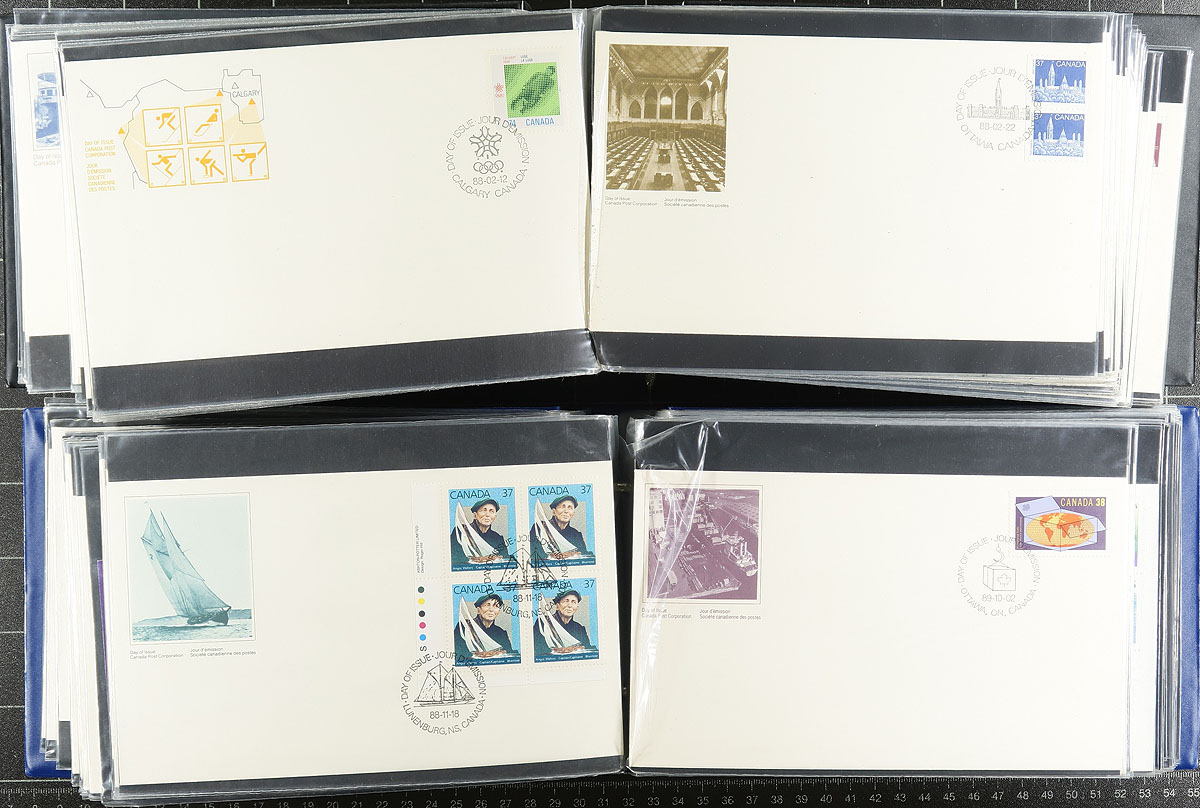 First Day Covers. Collection of roughly 525 Canada first day covers, 1973-2006, neatly organized in 7 cover albums. We note singles, sets, coils, blocks and plate blocks, souvenir sheets, and high denomination frankings. A clean lot for collectors and dealers alike. Estimate =