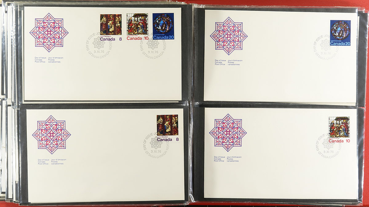 First Day Covers. Collection of roughly 525 Canada first day covers, 1973-2006, neatly organized in 7 cover albums. We note singles, sets, coils, blocks and plate blocks, souvenir sheets, and high denomination frankings. A clean lot for collectors and dealers alike. Estimate =
