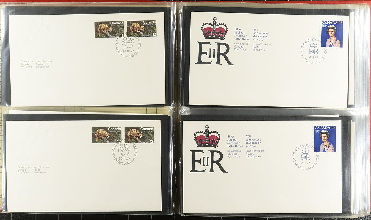First Day Covers. Collection of roughly 525 Canada first day covers, 1973-2006, neatly organized in 7 cover albums. We note singles, sets, coils, blocks and plate blocks, souvenir sheets, and high denomination frankings. A clean lot for collectors and dealers alike. Estimate =
