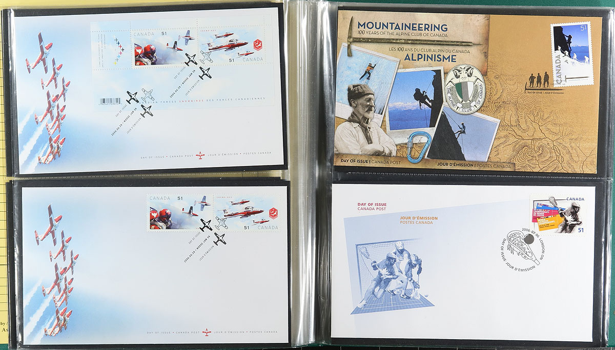 First Day Covers. Collection of roughly 525 Canada first day covers, 1973-2006, neatly organized in 7 cover albums. We note singles, sets, coils, blocks and plate blocks, souvenir sheets, and high denomination frankings. A clean lot for collectors and dealers alike. Estimate =