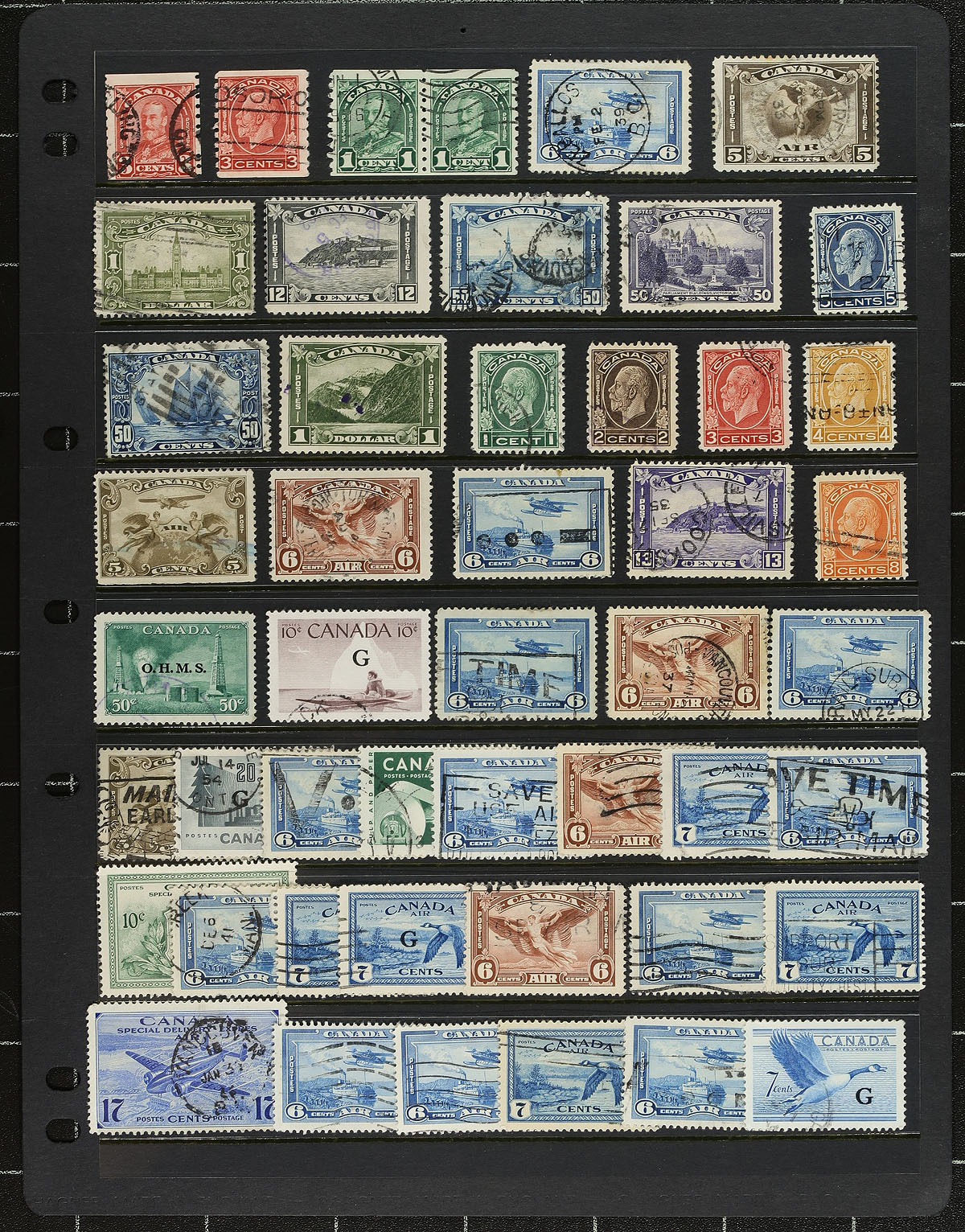 Stock of used Canada. Small Queens to the 1990's, containing well over 1,000 stamps in a variety of formats with roughly 75 album, stock, or manila pages. A spot check indicated low denomination Small Queens, Jubilees, sets and partial sets including Leafs up to Quebecs, with better representation from the Admirals to the 1940s, along with several modern issues, varieties, etc. Postmark interest includes cds, duplex, split ring, a few squared circles, and more, noting many socked on the nose town cancels. Duplication up to 10 for some issues. A nice lot, with a potentially high catalogue value, for the used collector or postmark hunter. Estimate =