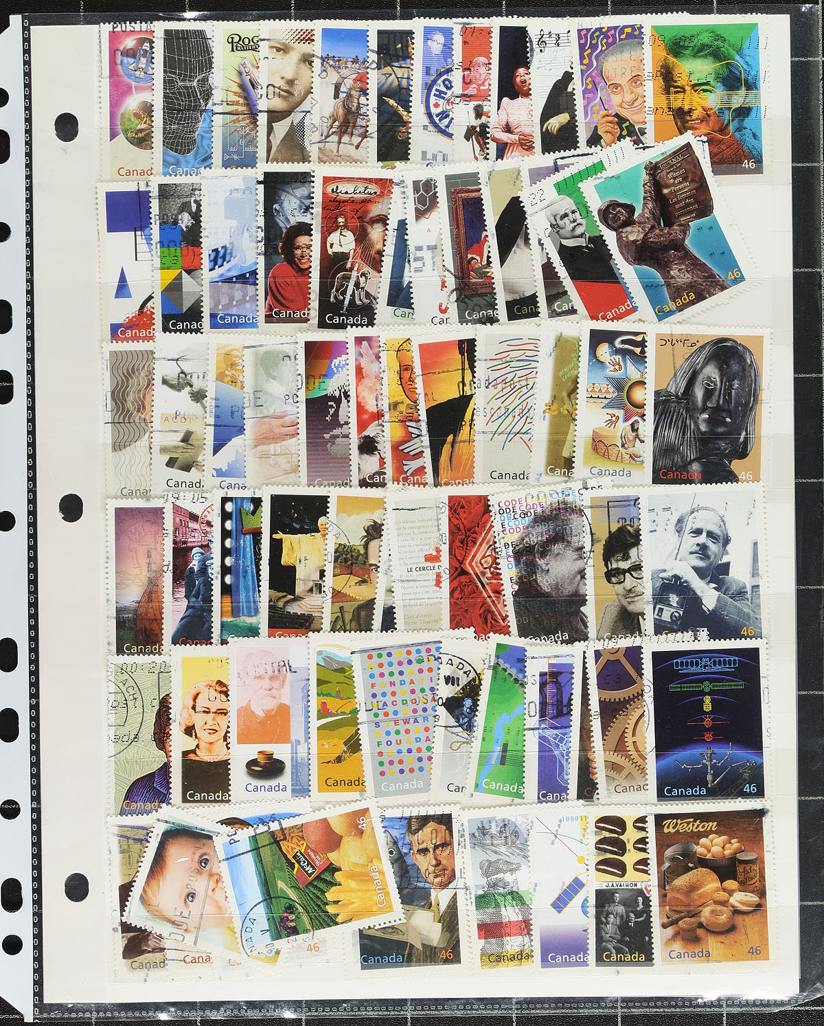 Stock of used Canada. Small Queens to the 1990's, containing well over 1,000 stamps in a variety of formats with roughly 75 album, stock, or manila pages. A spot check indicated low denomination Small Queens, Jubilees, sets and partial sets including Leafs up to Quebecs, with better representation from the Admirals to the 1940s, along with several modern issues, varieties, etc. Postmark interest includes cds, duplex, split ring, a few squared circles, and more, noting many socked on the nose town cancels. Duplication up to 10 for some issues. A nice lot, with a potentially high catalogue value, for the used collector or postmark hunter. Estimate =