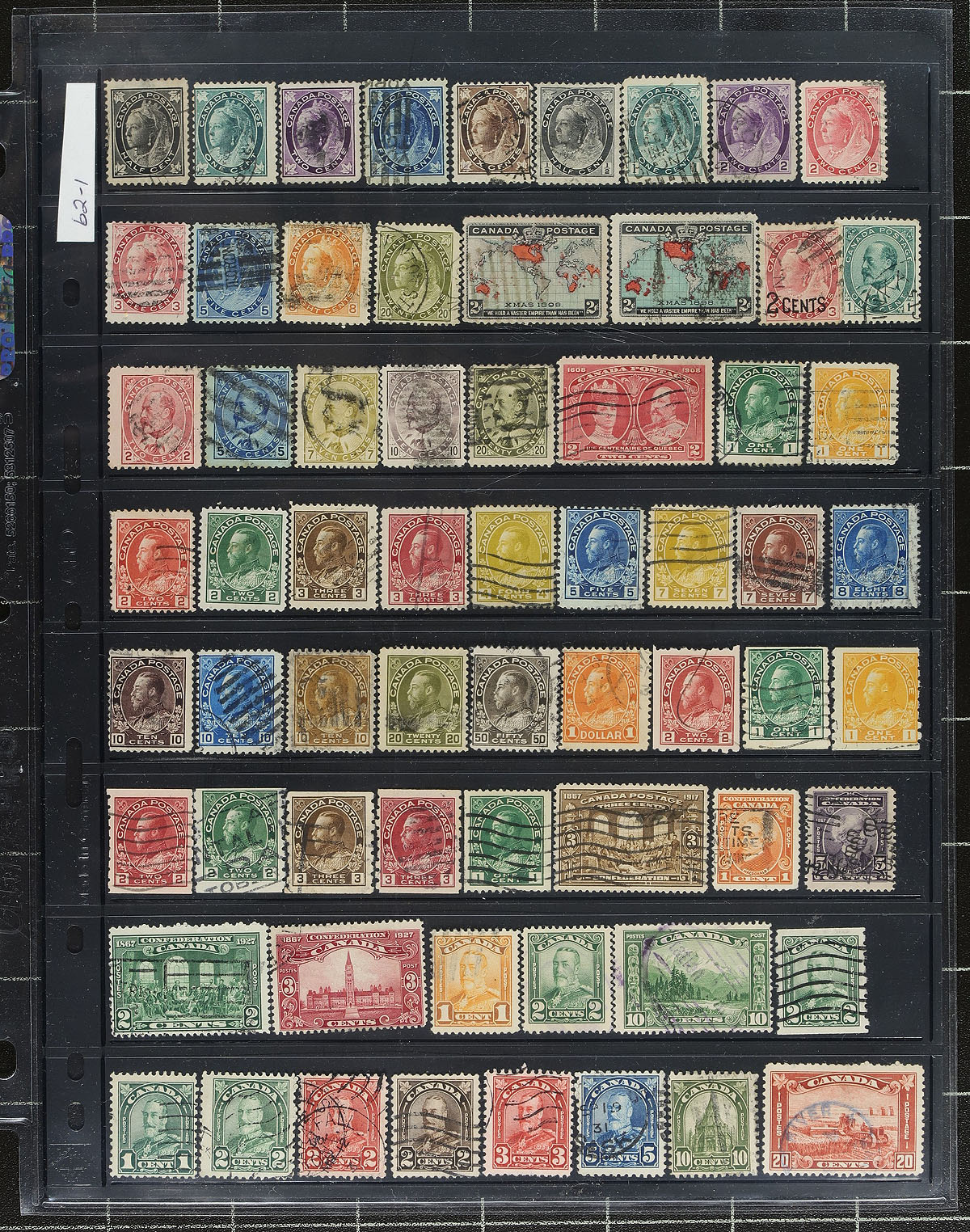 Stock of used Canada. Small Queens to the 1990's, containing well over 1,000 stamps in a variety of formats with roughly 75 album, stock, or manila pages. A spot check indicated low denomination Small Queens, Jubilees, sets and partial sets including Leafs up to Quebecs, with better representation from the Admirals to the 1940s, along with several modern issues, varieties, etc. Postmark interest includes cds, duplex, split ring, a few squared circles, and more, noting many socked on the nose town cancels. Duplication up to 10 for some issues. A nice lot, with a potentially high catalogue value, for the used collector or postmark hunter. Estimate =