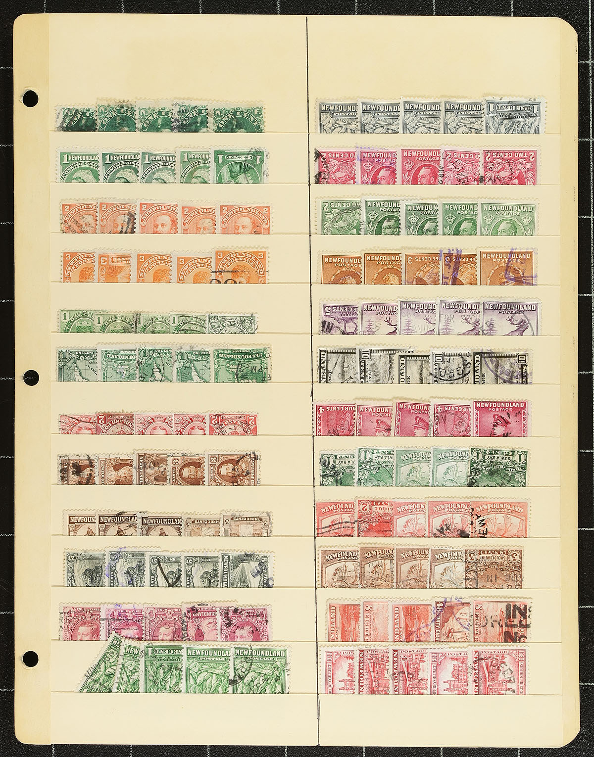 Stock of used Canada. Small Queens to the 1990's, containing well over 1,000 stamps in a variety of formats with roughly 75 album, stock, or manila pages. A spot check indicated low denomination Small Queens, Jubilees, sets and partial sets including Leafs up to Quebecs, with better representation from the Admirals to the 1940s, along with several modern issues, varieties, etc. Postmark interest includes cds, duplex, split ring, a few squared circles, and more, noting many socked on the nose town cancels. Duplication up to 10 for some issues. A nice lot, with a potentially high catalogue value, for the used collector or postmark hunter. Estimate =