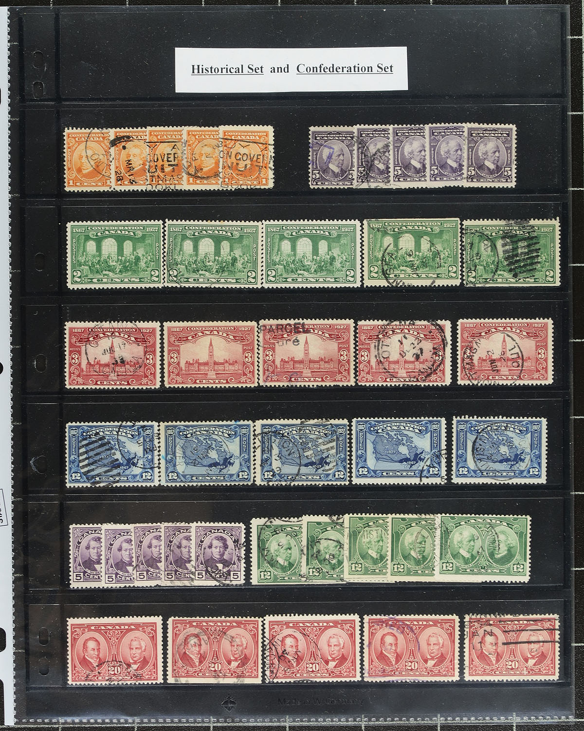 Accumulation of used Canada, 1870's to modern, containing many hundreds of stamps in several stock cards and dealer 102 cards. A spot check indicated Small Queens, Jubilees (noting 50c), partial and complete sets of Leafs, Numeral, Edwards, Quebecs on up, including the 50c Bluenose (x5), modern issues (including a few varieties), and more. Postmark interest includes cds, duplex, squared circles, and more, including socked on the nose town cancels. Duplication up to 10 for a few issues. A nice lot with a potentially high catalogue value, for the used collector or postmark hunter. Estimate =