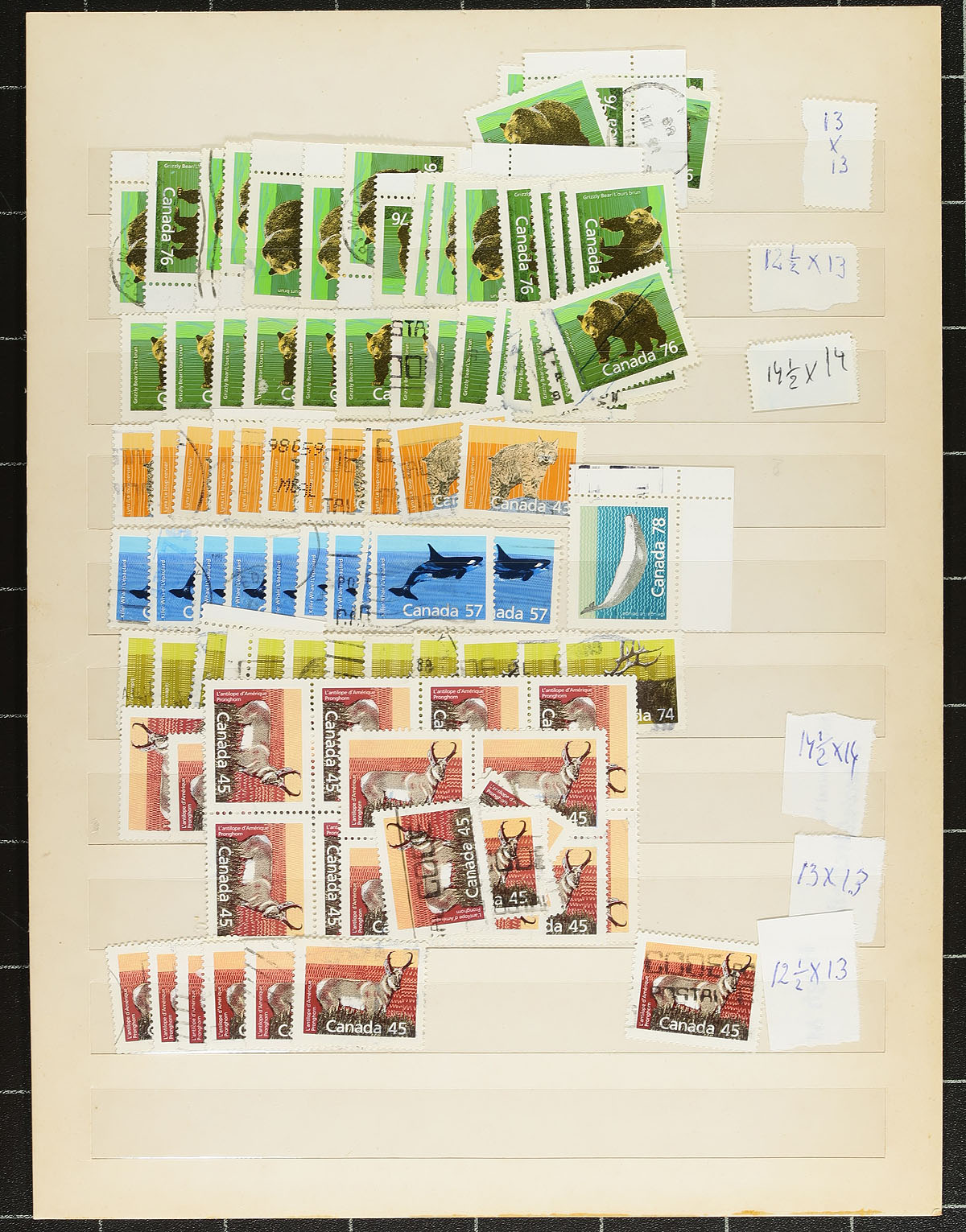 Accumulation of used Canada, 1870's to modern, containing many hundreds of stamps in several stock cards and dealer 102 cards. A spot check indicated Small Queens, Jubilees (noting 50c), partial and complete sets of Leafs, Numeral, Edwards, Quebecs on up, including the 50c Bluenose (x5), modern issues (including a few varieties), and more. Postmark interest includes cds, duplex, squared circles, and more, including socked on the nose town cancels. Duplication up to 10 for a few issues. A nice lot with a potentially high catalogue value, for the used collector or postmark hunter. Estimate =