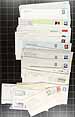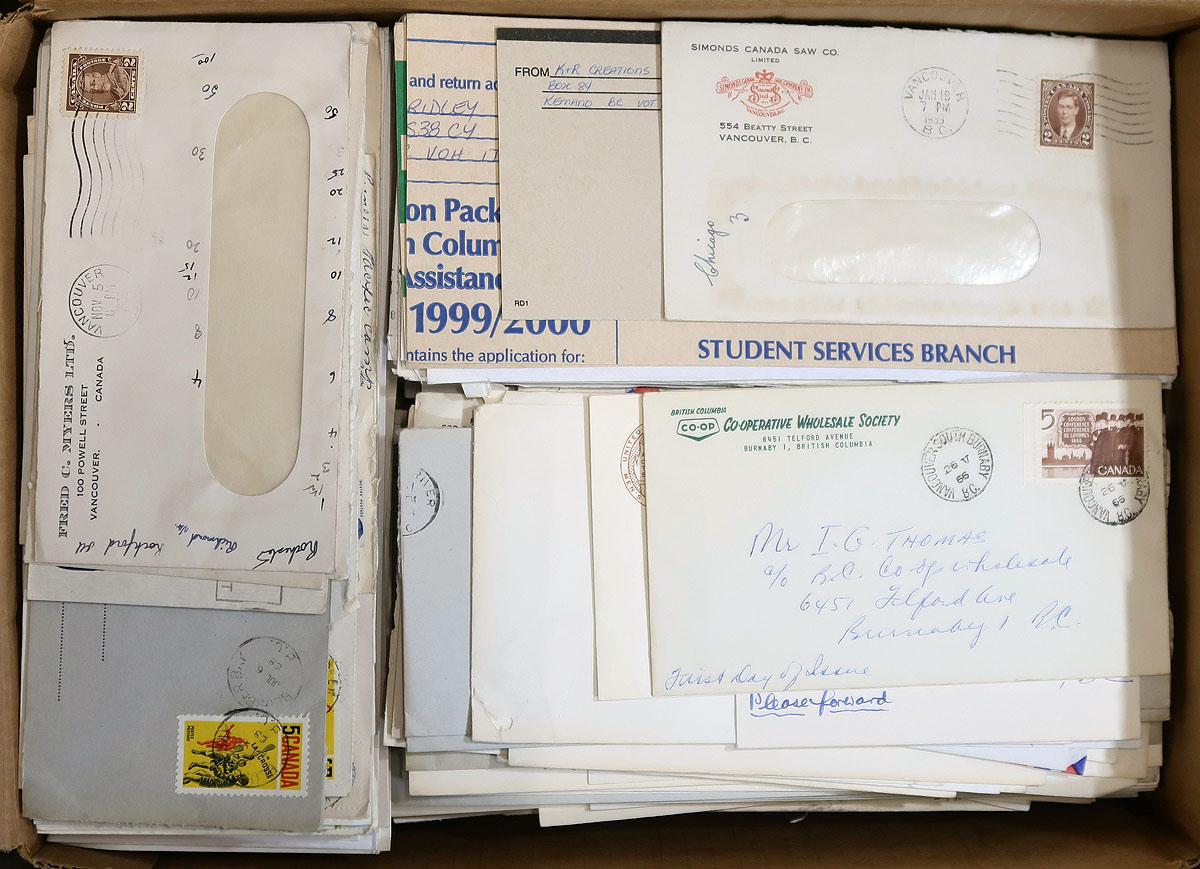 British Columbia Postal History. Accumulation of many hundreds of British Columbia covers with town postmarks, filling a small carton. A spot check indicated most material in the 1960's-1970's range, but did spot covers on either end of the given range. We note a few hundred different towns having cds, duplex, Klussendorf, slogan, POCON, among other postmark types, including some corner card advertising covers. Some of the covers are #10 in size, with a few faults with a few of the covers. A nice lot for the B.C. or Canada postmark collector. Estimate =
