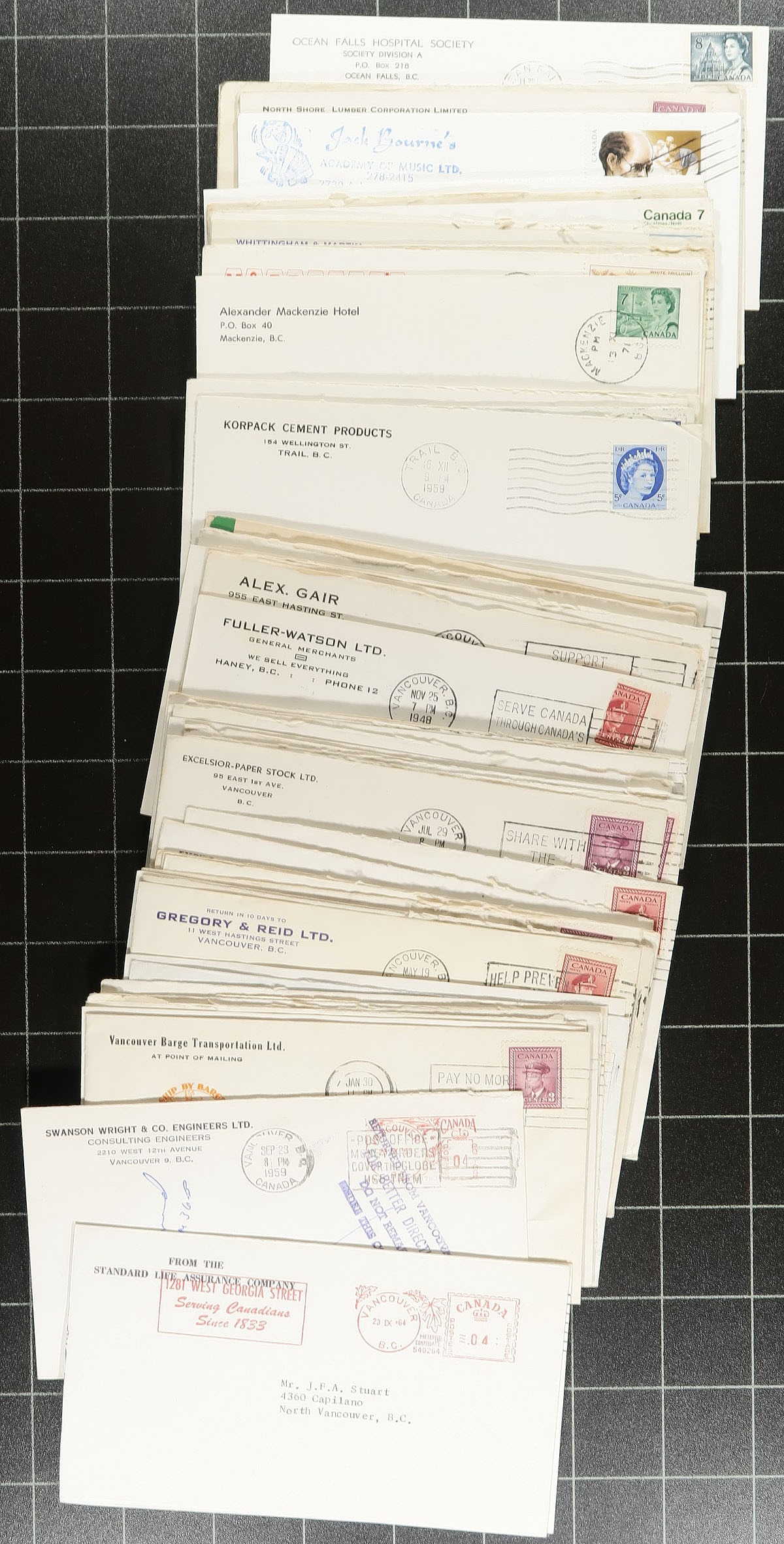 British Columbia Postal History. Accumulation of many hundreds of British Columbia covers with town postmarks, filling a small carton. A spot check indicated most material in the 1960's-1970's range, but did spot covers on either end of the given range. We note a few hundred different towns having cds, duplex, Klussendorf, slogan, POCON, among other postmark types, including some corner card advertising covers. Some of the covers are #10 in size, with a few faults with a few of the covers. A nice lot for the B.C. or Canada postmark collector. Estimate =