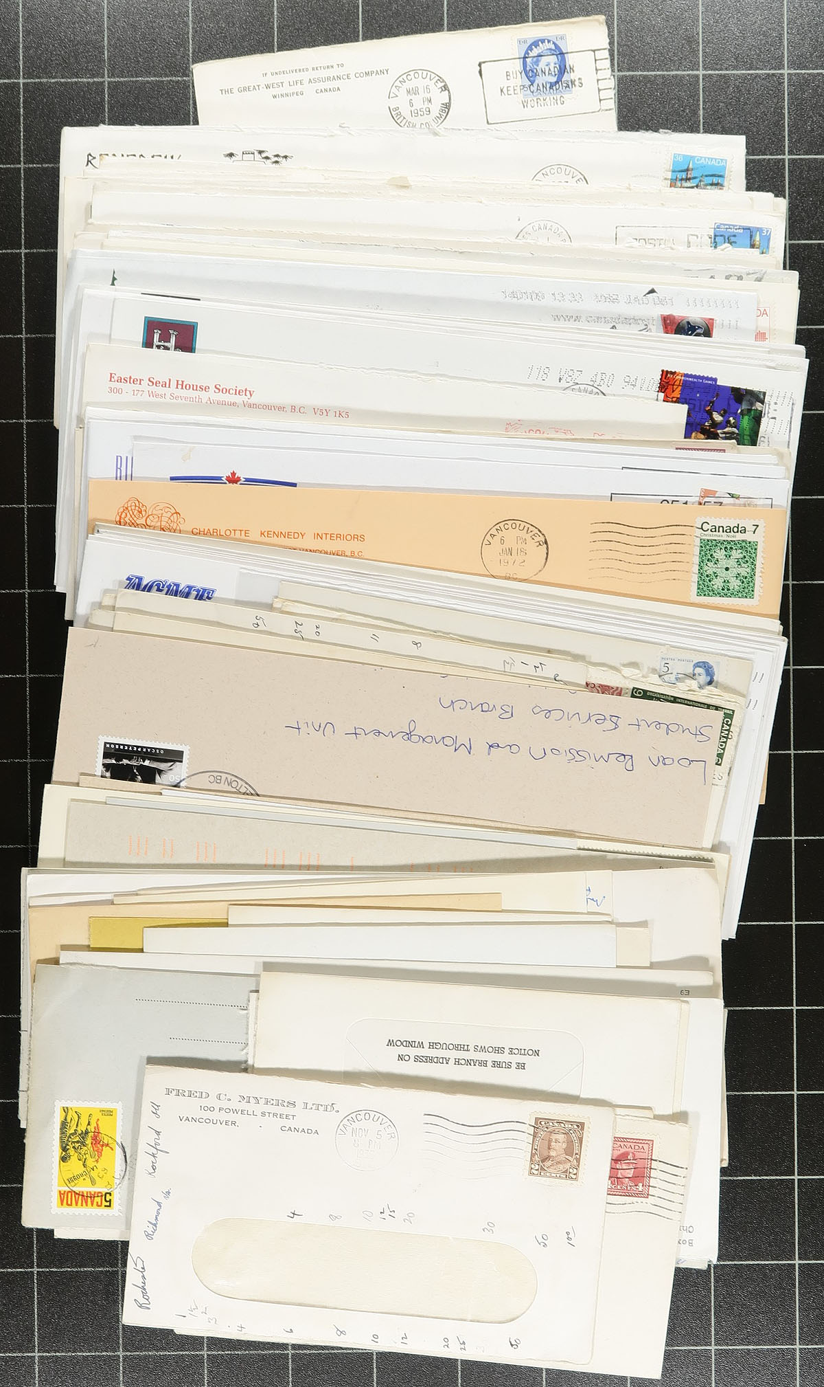 British Columbia Postal History. Accumulation of many hundreds of British Columbia covers with town postmarks, filling a small carton. A spot check indicated most material in the 1960's-1970's range, but did spot covers on either end of the given range. We note a few hundred different towns having cds, duplex, Klussendorf, slogan, POCON, among other postmark types, including some corner card advertising covers. Some of the covers are #10 in size, with a few faults with a few of the covers. A nice lot for the B.C. or Canada postmark collector. Estimate =