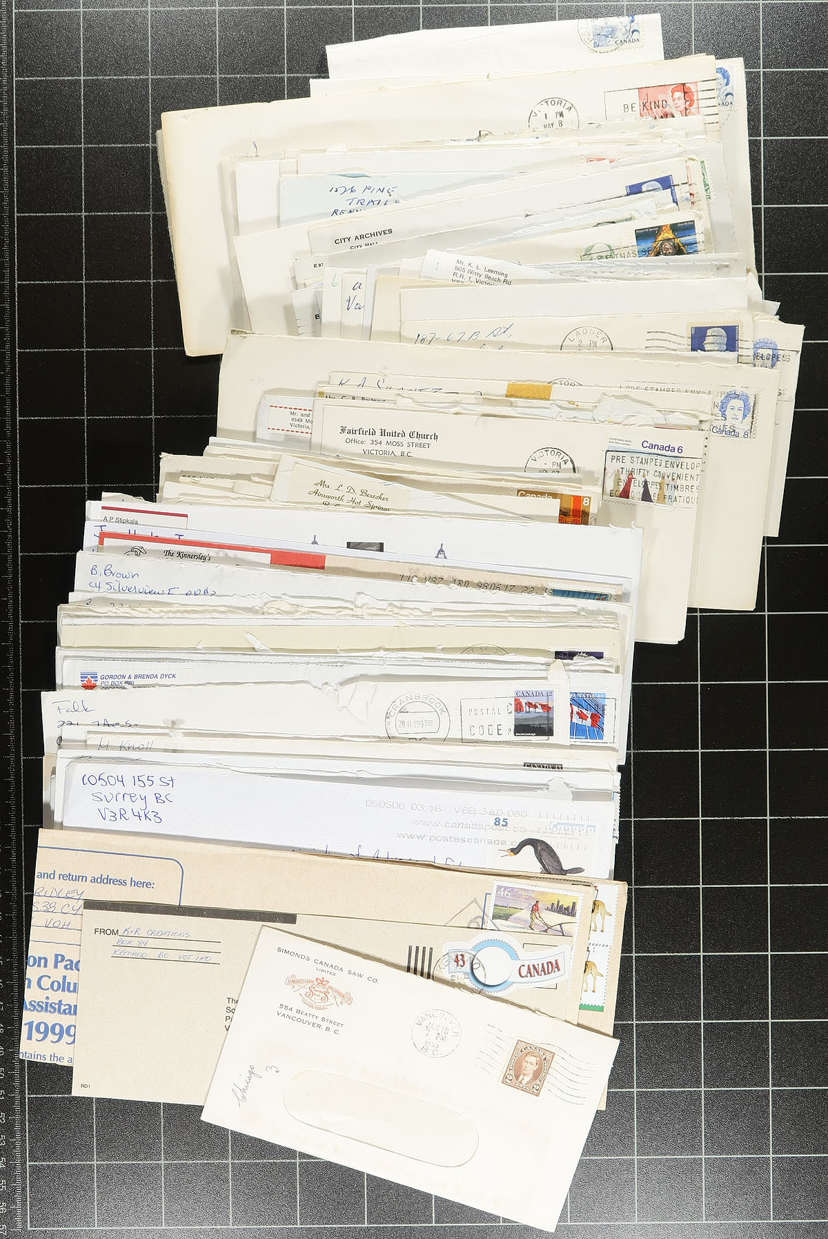British Columbia Postal History. Accumulation of many hundreds of British Columbia covers with town postmarks, filling a small carton. A spot check indicated most material in the 1960's-1970's range, but did spot covers on either end of the given range. We note a few hundred different towns having cds, duplex, Klussendorf, slogan, POCON, among other postmark types, including some corner card advertising covers. Some of the covers are #10 in size, with a few faults with a few of the covers. A nice lot for the B.C. or Canada postmark collector. Estimate =
